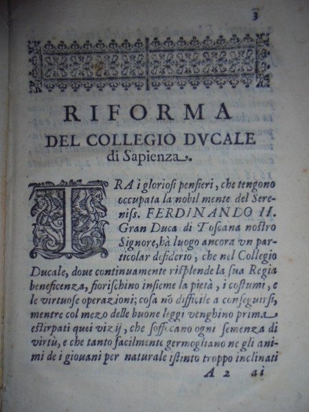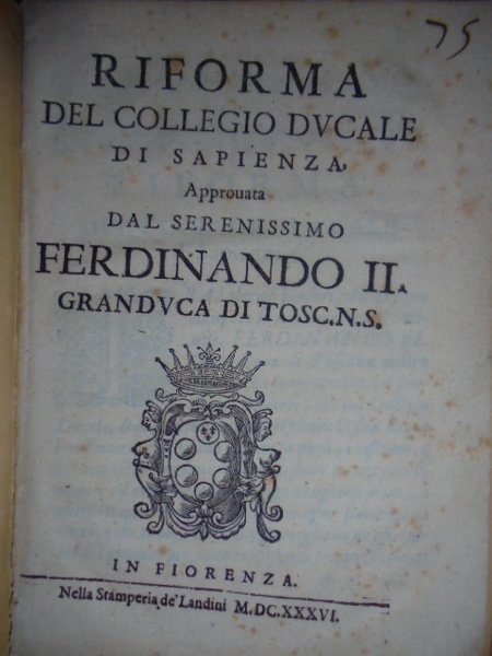 (Firenze) Bandi. RIFORMA del Collegio Ducale di Sapienza, approvata dal Serenissimo Ferdinando II Granduca di Toscana N.S