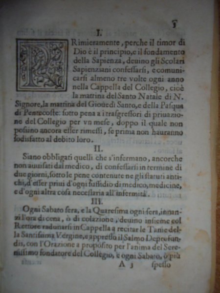 Bandi. RIFORMA del Collegio Ducale di Sapienza, approvata dal Serenissimo Ferdinando II Granduca di Toscana N.S. In Fiorenza, nella Stamperia de' Landini, 1636. In-4° antico, cop. in varese. (14) pp., 1 f. bianco. Arme ducale nel front. Raro opuscolo. Pac. 3. Uff. Mob. 3