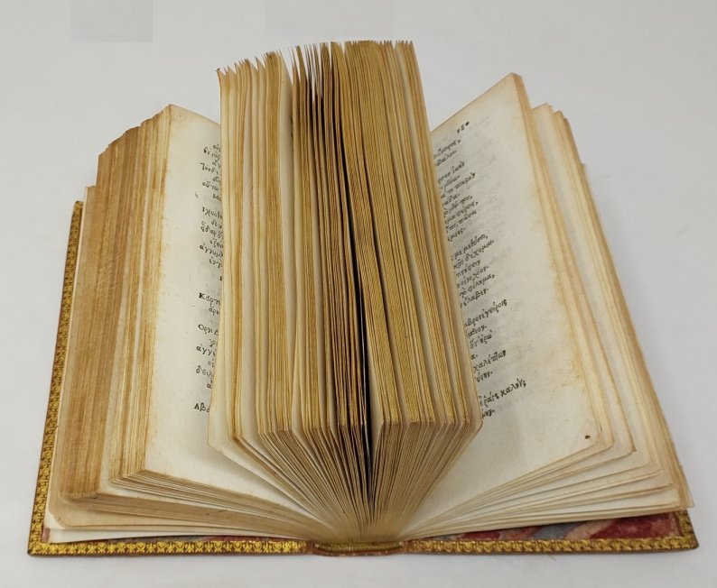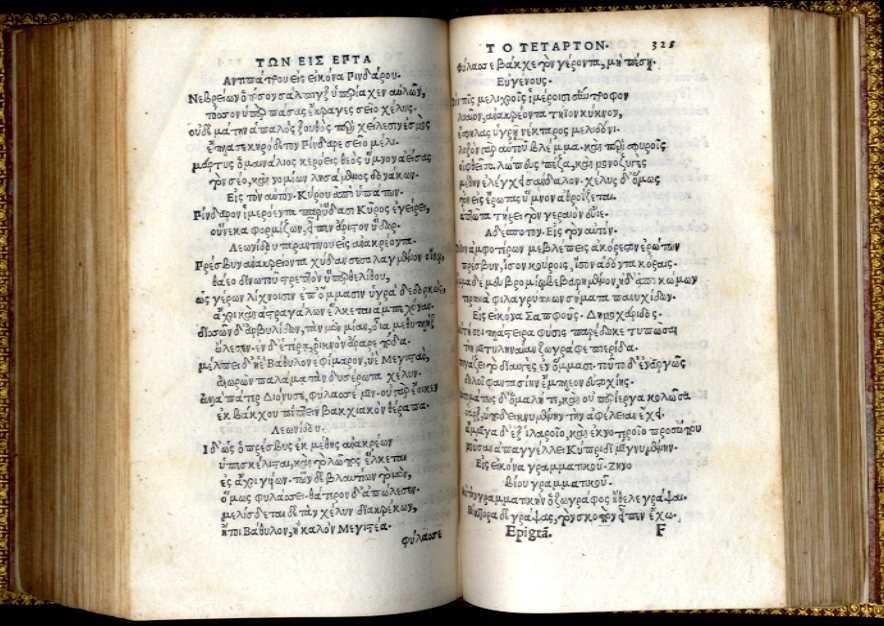 >in-8 (157x95 mm), ff. 310 (su 312, mancando 2 ff. nn. in fine, di cui il primo con impresa tipografica e l'altro bianco; dopo il f. 100 la numerazione per errore prosegue col f. 201 e di conseguenza l'ultimo è numerato 410; la segnatura c, anziché 17-24, è numerata 25-32). Legatura settecentesca in piena pelle con bordura oro sui piatti, dorso a nervi con titoli e fregi oro, tagli dorati, dentelles interne. Titolo in latino e greco, lettera-guida per le iniziali. Importante edizione, più rara dell'aldina del 1503, a sua volta esemplata su quella di Firenze del 1494, di quest'antologia che in sette libri raccoglie la produzione letteraria dei poeti epigrammatici greci. Lievi bruniture sparse ma bell'esemplare, con ex-libris cartaceo della ''North Library'' applicato al primo contropiatto e le medesime armi impresse a secco nella parte alta dei primi 4 fogli. Decia-Delfiol, Annali dei Giunti I, n. 119. BMC 313. Adams A-1182.Renouard XLIII, n. 14.