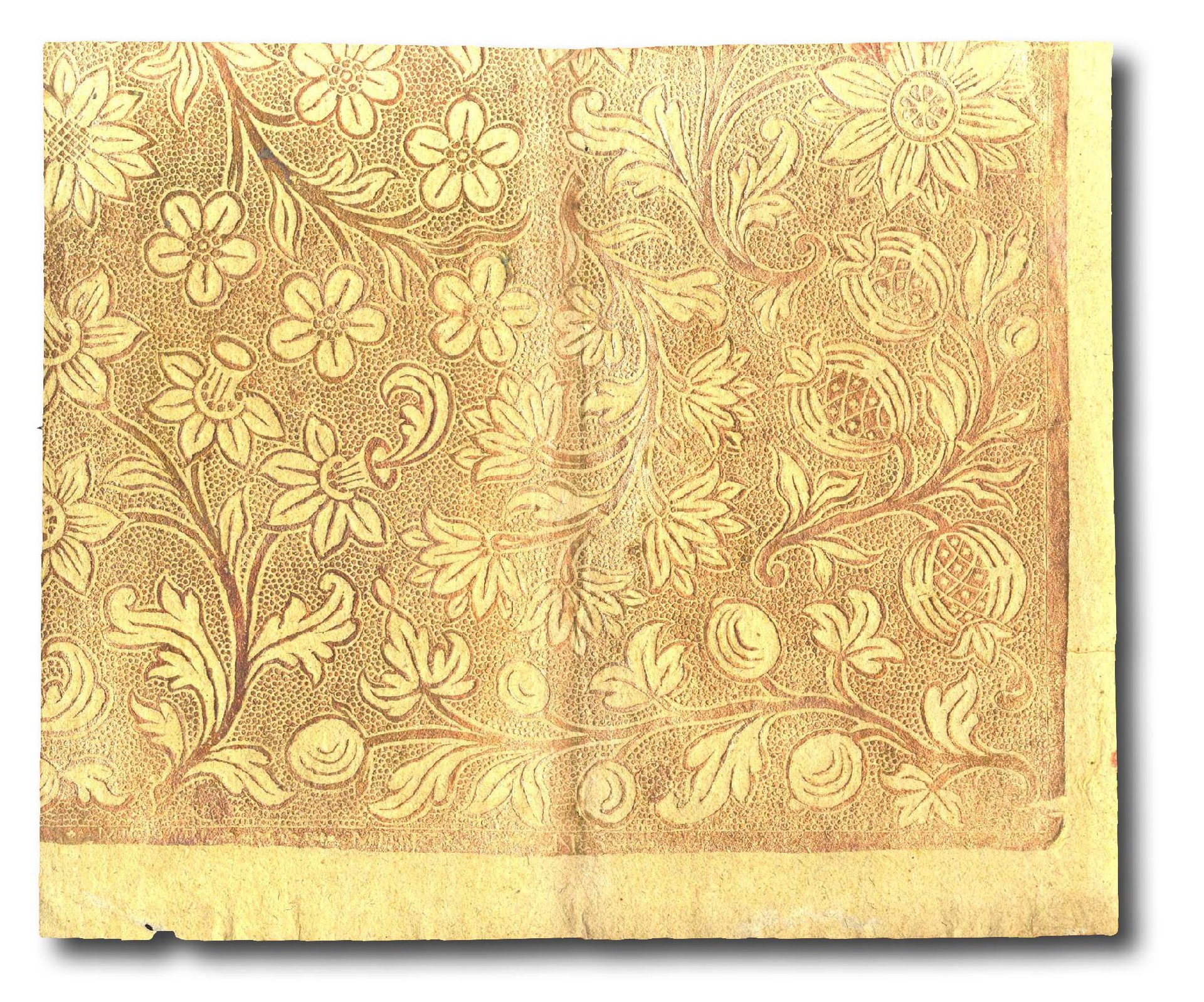 >Foglio di carta dorata a rilievo (mm 172x204) su carta avorio, dipinta a pennello in oro con alternanza di superfici cave dorate e non dorate in rilievo. Motivo: Tralci d'acanto dorati con fiori di tulipano, melograni e baccelli. In basso il margine della matrice porta impresso: MEYER Nr. 2" . Il laboratorio di Johann Wilhelm Meyer ha svolto l'attività fra il 1740 e il 1780. Cornicetta conservata su un lato.