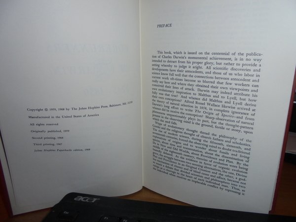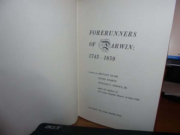 Bentley, Glass - Owsei, Temkin - William, L. Straus Jr. under the auspices of The Johns Hopkins History of Ideas Club. Baltimore, The Johns Hopkins Press, 1968. FORERUNNERS of DARWIN 1745 - 1859. In-8°, tela edit.con titolo in nero al dorso. (vi), 471 pp. con alcuni ritratti nel testo. Come nuovo. Uff. C - III - 6