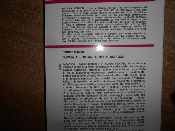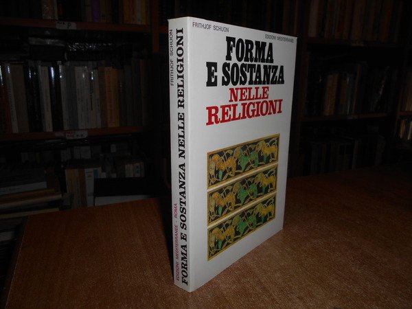 FRITHJOF SCHUON. Roma, Edizioni Mediterranee, 1984. Forma e sostanza nelle religioni. In-8°, br. ill a col. 231 pp. Come nuovo. Uff. stanzetta mob. piccolo a destra