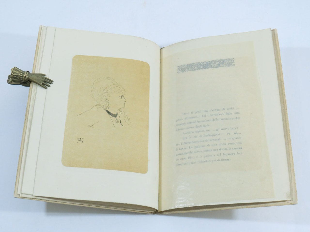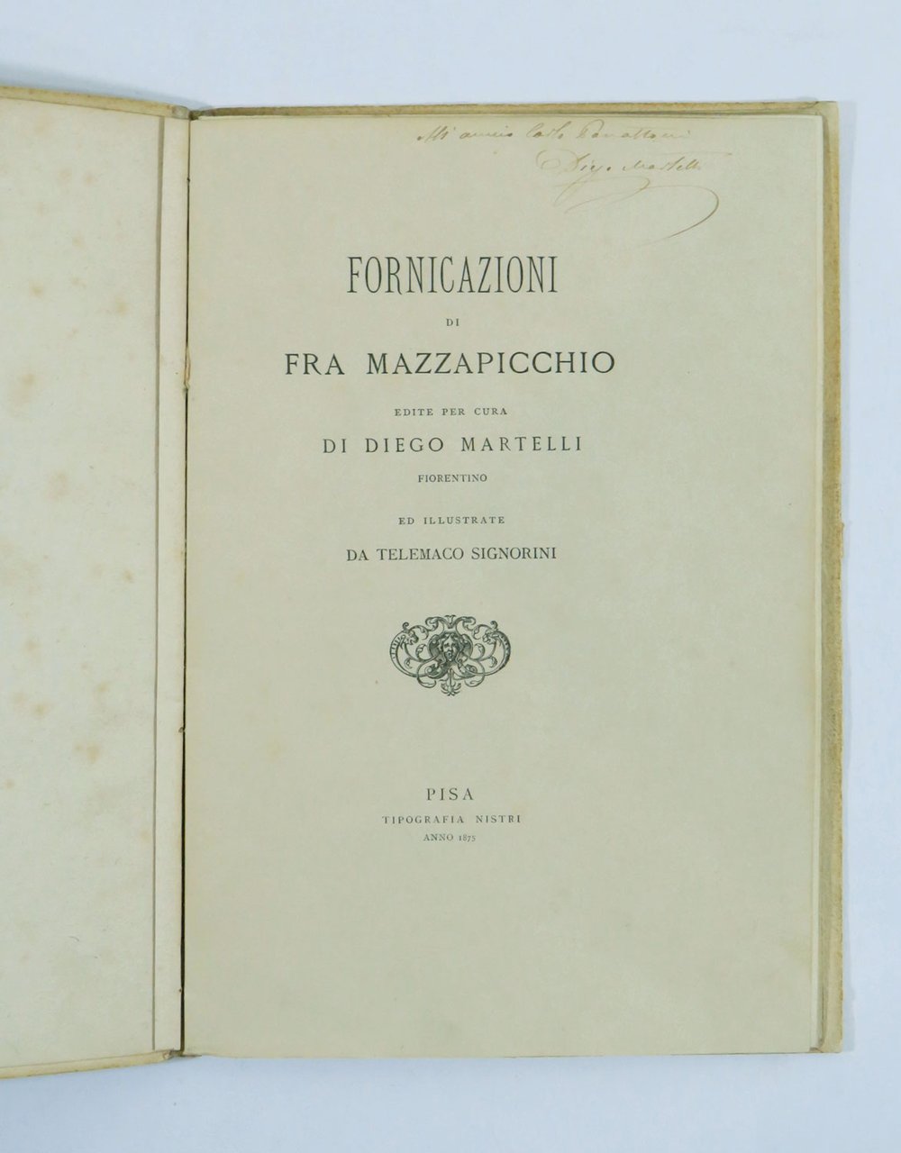 LIBROEdizione originale.CON AUTOGRAFO.Bell’esemplare nella legatura originale, pregiato da invio autografo di Diego Martelli al frontespizio.Delizioso libro d’artista impresso in soli 100 esemplari dichiarati all’ultima carta. Raccolta di prose erotiche attribuite al francescano padre Didaco di San Friano (Borgo San Frediano, a Firenze), ornate da tre splendide acqueforti del macchiaiolo e impressionista Signorini. Assieme ai «Primi passi» (1871) e alle «Storielline» (1876), sempre a petto delle prose di Martelli, questo libro compone un trittico che è ritenuto tra le migliori prove del Signorini incisore. -- «[…] forse il meglio della sua opera grafica […] il Signorini lo diede nelle illustrazioni delle tre raccolte di novelle veristiche di Diego Martelli […] Costretto a dir tutto in breve spazio, qui il Signorini vi riuscì senza disperdere le sue forze; e il segno aderì più strettamente al soggetto propostogli dall’amico Diego, che d’altra parte lo riportava in un clima ben confacente alle sue tendenze e ai suoi umori. Di questo gruppo, l’acquaforte che illustra la prima novella delle ‘Fornicazioni di Fra Mazzapicchio’, quella che dà il titolo al libro, vale per l’efficacia della rappresentazione e per un tocco magro e conclusivo, che superano l’evidente ispirazione letteraria» (L. Vitali, «L’incisione italiana dell’Ottocento», in: Domus 29, maggio 1930, pp. 31ss.)Parenti, Rarità, II, p. 174s.