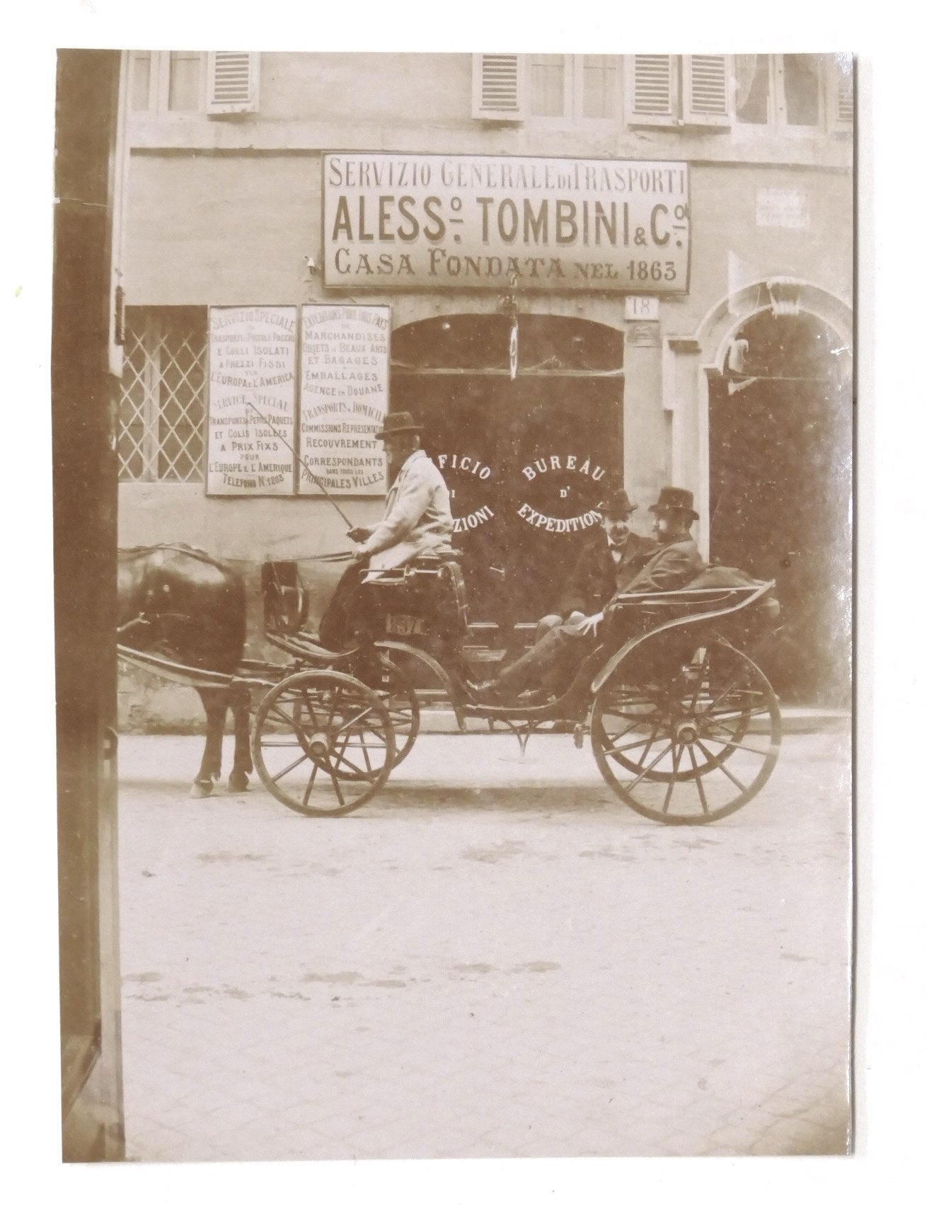 Fotografia Carrozza Società Trasporti Tombini & C. - 1900 ca. Dimensioni: 8 x 11 cm ca. Condizioni buone. Piccola piega al bordo sinistro.  Â