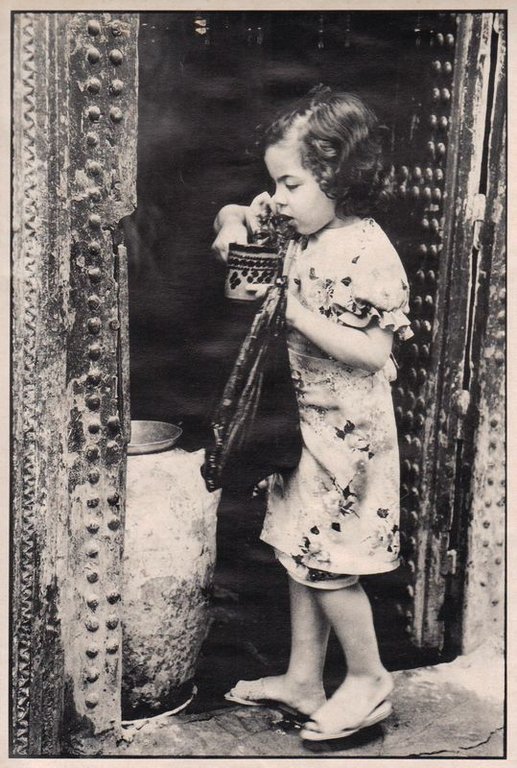 Fotografia di una bambina marocchina ritratta nell'atto di bere. Ingrandimento in stampa retinata.