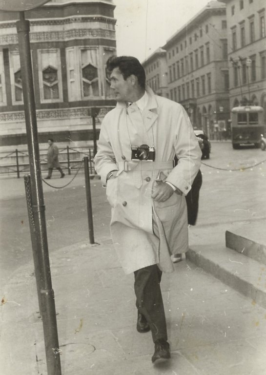 Fotografia originale della fine degli anni '50 del Novecento raffigurante l'attore americano Jack Palance (1919 - 2006), in piazza del Duomo, a Firenze. Palance cammina, con alle spalle il Campanile di Giotto, in impermeabile chiaro e con reflex al collo. Mm. 147x105. Ottime condizioni.