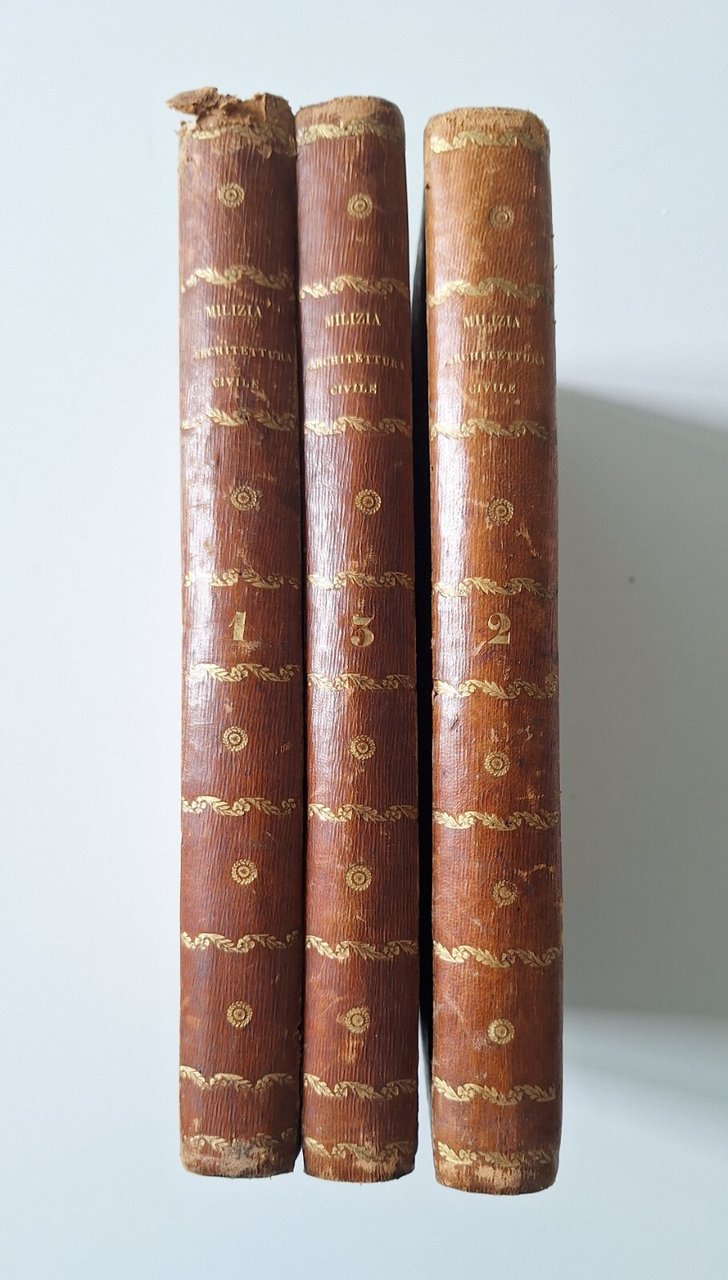 FRANCESCO MILIZIA PRINCIPJ DI ARCHITETTURA CIVILE BASSANO REMONDINI 1813In 8°, legatura in mezzapelle con titolo e fregio in oro al dorso, 3 vol., pag. 280 + 10 tavole ripiegate in b/n, 308 + 13 tav., 263+ 13 tav.Lievi abrasioni ai dorsi, slabbratura della cuffia superiore al primo volume. Piccoli tarli alle cerniere ma non alle pagine. Pagine con tenui e sporadiche ossidature. Legatura solida.TUTTI I NOSTRI LIBRI SONO VISIBILI PREVIO CONTATTO MAIL, TELEFONO O WHATSAPP NELLA NUOVA SEDE DI MILANO: LIBRERIA COSMOPOLIS, VIA JOMMELLI 22, MILANO.3313109672
