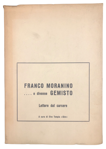 In-8° (cm. 22x15,2), pp. 98. Cartoncino leggero edit. Contiene: 1) GIM (Elvio TEMPIA), Elemento per una BIOGRAFIA di Gemisto. 25 pp. 2) Idem, DISCORSO tenuto a CURINO il 9 maggio 1944, contro a condanna di un innocente. 19 pp. 3) Franco MORANINO. Lettere dal carcere (1941-1943). Pp. 54. MORANINO (Tollegno 1920 - Grugliasco 1971), scritto al Partito comunista clandestino nel 1940, l'anno successivo venne arrestato e condannato a 12 anni di carcere da parte del Tribunale speciale. Detenuto a Civitavecchia, venne liberato nel 1943 a seguito della caduta del fascismo e, dopo il successivo armistizio, entrò nella Resistenza. Inviato dal PCI nel BIELLESE, assunse il nome di battaglia di "Gemisto", diventando comandante del Distaccamento delle Brigate Garibaldi denominato "Pisacane". Formò la repubblica di POSTUA, "Gemisto" organizzò scioperi operai ignorando le indicazioni del comando militare partigiano, dei comunisti stessi e dei sindacalisti che lo invitarono a limitarsi alla sua attività militare di partigiano. Condannato a più riprese dal 1949 al 1958 per la strage di Portula, scappò ed ebbe il sostegno di "Soccorso Rosso". Graziato nel 1965, preferì rientrare solo alla scadenza della pena nel 1968. Censito in 9 bibl.