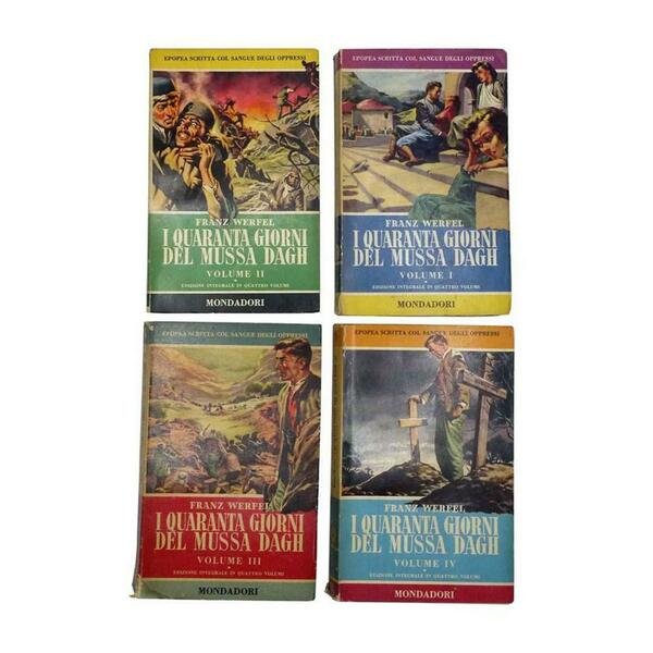 Autore: Franz Werfel Titolo: I quaranta giorni del Mussa Dagh Sottotitolo: 4 Volumi Edizione: Arnoldo Mondadori Editore 1953 - Prima edizione Dimensioni: 11,5 x 18 cm c.a. (1X) Copertina: Brossura Condizioni: Ottime come da foto