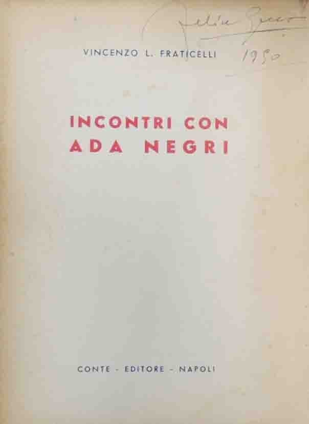 Vincenzo L. Fraticelli, Incontri con Ada Negri, Conte Editore, Napoli 1948, pp. 99, 1 c. di tavv. f.t. ill. b.n., cm 22, br. ed. Indice: Avvertimento – Incontro con Ada Negri – Lirica e prosa – Il romanzo degli anni acerbi: Stella mattutina – Ultima invocazione – Notizia bio-bibliografica. Firma d’appartenenza e data alla prima di copertina e alla prima pagina. Minime tracce d’uso alla brossura, alcune annotazioni manoscritte in grafia minuta ed elegante alla quarta di copertina, qualche sottolineatura a pastello, bruniture, per il resto molto ben conservato.