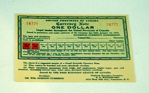 Free Economy League of Canada Sample United Provinces of Canada / Gesell Scientific Currency Note / Membership Application