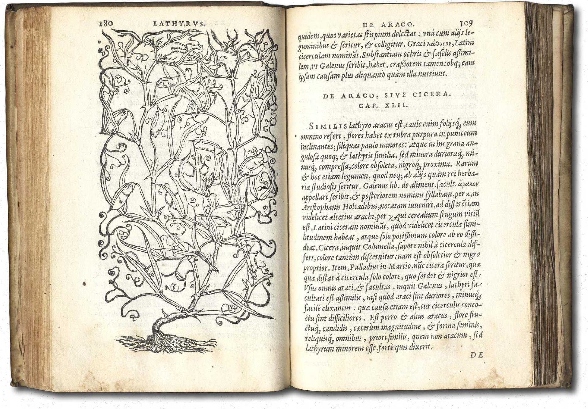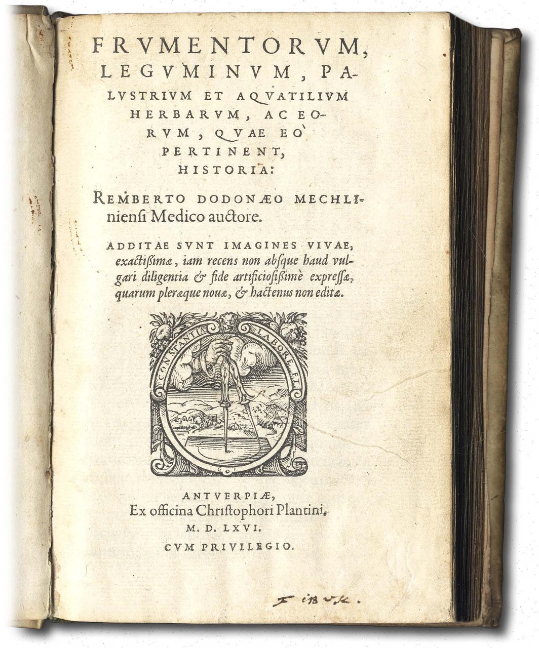 >in-8, pp. 271, (9), leg. coeva piena perg. rigida, titolo ms. al dorso. Carattere corsivo, greco e rom.; riccamente illustrato da 84 silografie di piante, per la maggior parte a piena pagina, realizzate da Gerard Janssen van Kampen, Cornelis Muller e Arnold Nicolai su disegni di Pieter van der Bocht; marca al tit. (compasso retto da una mano che esce dalle nuvole con motto ''Labore et constantia''), iniziali istoriate. Precede il testo la dedica a ''D. Viglio Zuichemo, S. Bavonis Gandavensis praeposito'' datata 1565 e la prefazione dell'autore al lettore. Prima edizione di questo interessante trattato sui cereali e su varie specie di piante palustri ed acquatiche realizzato da Dodoens, medico e botanico olandese (1517-1585) che compì numerosi viaggi in Francia, Inghilterra ed Italia; divenne medico dell'imperatore Massimiliano II (1574) ed in seguito professore a Leida. Raro, censito in sole 5 biblioteche italiane. Buon esemplare (lievi ingialliture, alone d'umido al margine esterno degli ultimi dieci ff.). Ex-libris di Maurice Villaret. Nissen 513. Graesse II, 416. Davies, 136. Pritzel 2346.