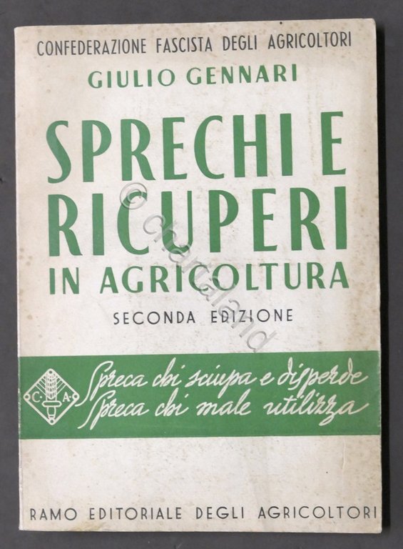 G. Gennari - Sprechi e ricuperi in agricoltura - 1943 Seconda edizione ampliata ed interamente riveduta Pag. 228 con illustrazioni. Copertina morbida - Testo in italiano. Condizioni molto buone. Copertina come da foto.
