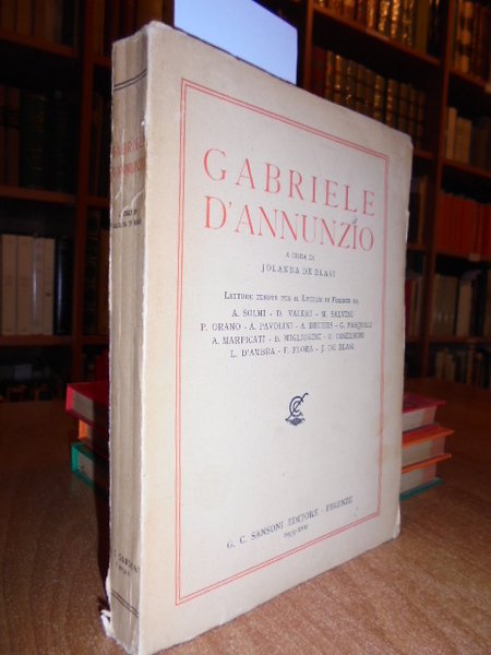 GABRIELE D' Annunzio a cura di Jolanda De Blasi. Letture tenute per il Lyceum di Firenze da: A. Solmi, D. Valeri, M. Salvini, P. Orano, A. Pavolini, A. Bruers, G. Pasquali, A. Marpicati, B. Migliorini, E. Coselschi, L. D' Ambra, F. Flora, J. De Blasi. Firenze, Sansoni Editore, 1939. In-8°, cart. edit. orig. 334 pp. Ben conservato. Neg. Lett. mod. nob. H