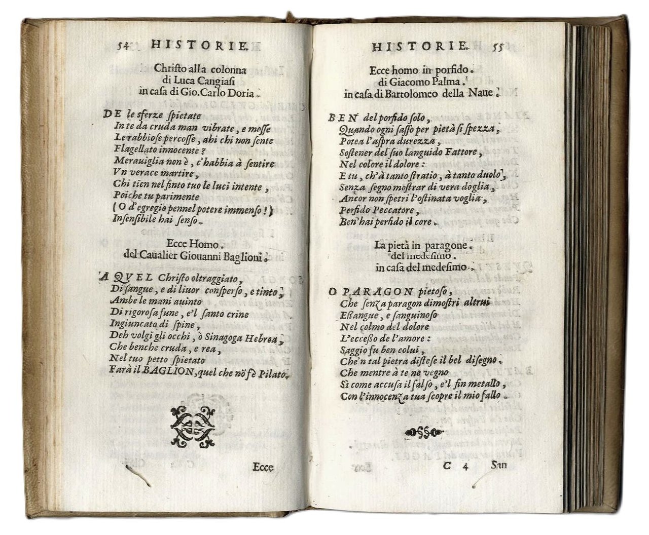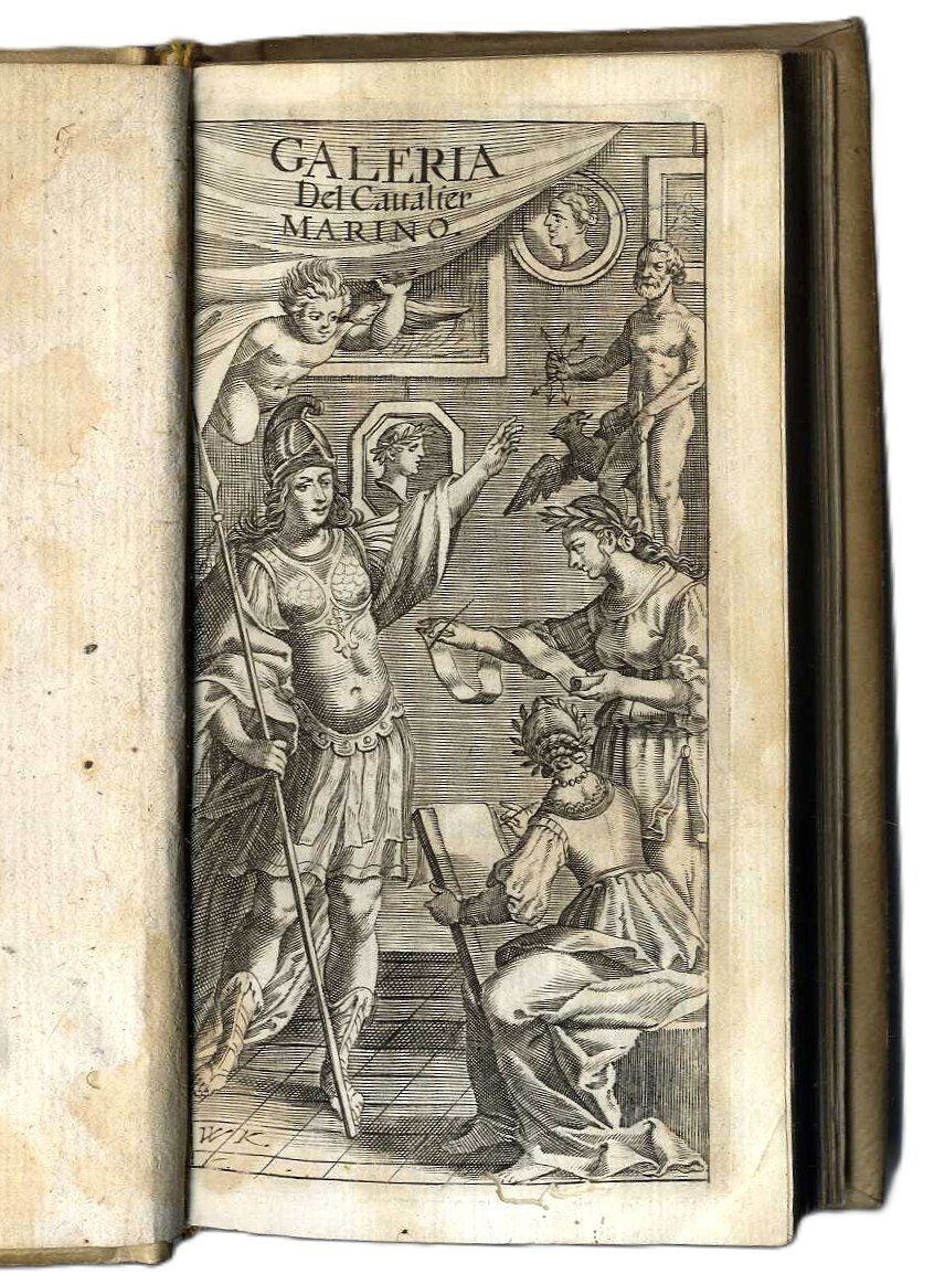 >2 parti in un vol. in-12, pp. 292 (compreso titolo inciso), (20, le ultime 2 bianche), legatura coeva in piena pergamena rigida, titolo ms. al dorso (piccolo lavoro di tarlo). Bel frontespizio con figure allegoriche finemente inciso in rame (sigla ''WK''). Edizione non comune, priva di ogni nota tipografica (la prima Milano 1620). La prima parte (''Le pitture'') è ''distinta in favole, historie, ritratti & capricci''; la seconda (''Le sculture''), che inizia a pag. 255, in ''statue, rilievi, modelli, medaglie & capricci''. Trattasi di componimenti poetici di vario metro del noto poeta e letterato napoletano (1569 -1625), descriventi dipinti e statue di grandi artisti (tra cui Rubens, Correggio, Carracci, Dürer, Tiziano, Michelangelo, ecc.), riuniti in una specie di galleria ideale e classificati per soggetto: storici, mitologici, ritratti (Dante, Petrarca, Tasso, Bembo, Ronsard, ecc.). Grazioso volumetto (lavoretto di tarlo al margine inferiore dei primi 30ff, e degli ultimi 2. Michel-Michel V, 123.