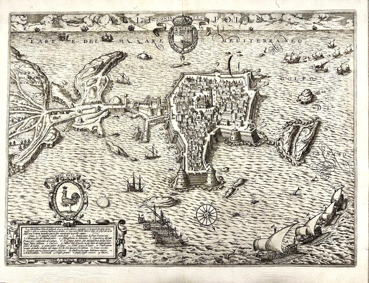 >Incisione in rame (mm 375x515e margini). Tratta dall'opera "Civitates Orbis Terrarum" (volume V) pubblicato per la prima volta nel 1598. Testo latino al verso. Bellissima veduta a volo d'uccello della città fortificata di Gallipoli con il castello angioino aragonese in primo piano. Lungo la parte superiore del rame il titolo"Gallipolis" e lo stemma araldico. In basso a sinistra una breve descrizione della città e la legenda, il tutto entro elaborato cartiglio sormontato da gallo con motto "Nec animus fato minor". Incisa da Natale Bonifacio di Girolamo (attivo a Roma e Venezia attorno al 1580) da un disegno di Giovan Battista Crispo (Gallipoli, 1550 circa – Roma, 1598 circa). Bell'incisione animata da imbarcazioni a vela ed animali marini Esemplare nitidamente inciso, ben conservato.