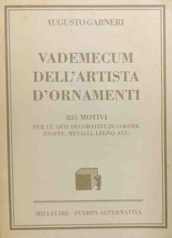 Augusto Garneri, Vademecum dell’artista d’ornamenti. 835 motivi per le arti decorative in colore, stoffe, metalli, legno, ecc., Stampa Alternativa, s.l. (ma stampato a Roma, presso la tipografia Graffiti) 1996, pp. 54, in gran parte ill. b.n., cm 14, opuscolo spillato. Collana Millelire. Edizione speciale fuori commercio per librerie fiduciarie realizzata in 3000 copie numerate. La presente copia è l’esemplare n. 542. Pubblicazione tratta da: Vademecum dell’artisata d’ornamenti compilato da Augusto Garneri, G. B. Paravia 1891. Lievissime tracce d’uso, minimi segni del tempo, per il resto ben conservato. Raro.