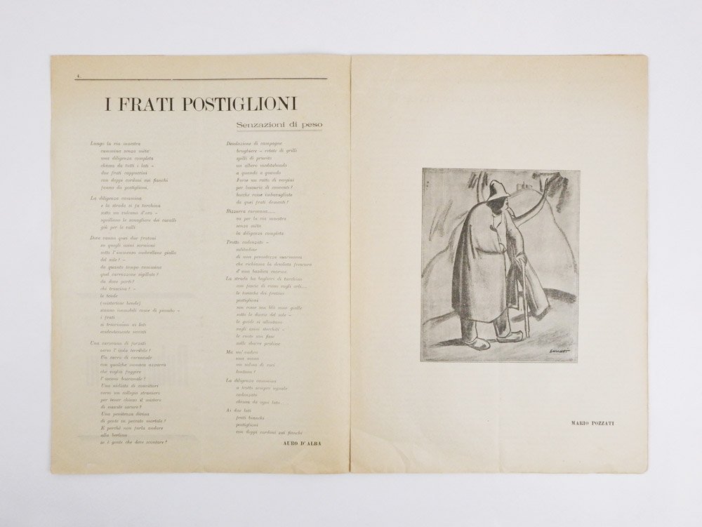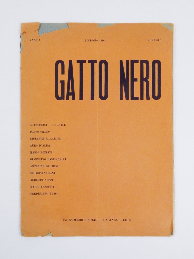 PERIODICOEdizione originale.Esemplare ancora completo della fragile copertina e delle pagine pubblicitarie iniziali e finali, spesso mancanti; lacune perimetrali in copertina, senza perdite significative; per il resto fragile fascicolo molto ben conservato.Rarissimo numero primo e unico pubblicato di questa rivista modernista e “neoliberista” nata sotto gli auspici di Lionello Fiumi e contenente un’interessante pezzo di Giannotto Bastianelli («La critica e l’artista moderno italiano»), un’altrettanto interessante lirica del fondatore e direttore Foschini, una tavola a piena pagina di Mario Pozzati e poi contenuti più d’occasione, tra i quali liriche di Villaroel, Venditti e Auro d’Alba, prose di Paolo Orano, Sebastiano Sani, Alberto Neppi e Ferdinando Russo. Delle sole tre localizzazioni ICCU, due esemplari si trovano all’Archiginnasio di Bologna, uno alla Centrale di Firenze e uno («non disponibile») alla Centrale di Roma. -- A distanza di un anno dal termine dell’avventura del «Fuoco», «rassegna d'arte e pensiero» irregolare uscita in quattro fascicoli nel 1914 e altrettanti nel 1915, dichiaratasi «Organo del neoliberismo» proprio nell’ultimo numero uscito nel maggio 1915, il diciannovenne romagnolo Antonio Foschini lancia — in co-direzione con un coetaneo, tal Pio Casale — il «Gatto nero»: «a noi è sembrato opportuno intitolare così la nostra rivista perché amiamo forse dell’amore di Baudelaire i bei gattoni neri dagli occhi d’oro e perché un giorno ci è saltato sott’occhio il magnifico paradosso di Govoni. “I gatti sono i poeti degli animali così come i poeti sono i gatti degli uomini”» (p. 2). I bibliografi sono rimasti estremamente cauti nell’indicare l’effettiva consistenza della rivista (Salaris, per tutti, parla di «primo e finora unico numero rintracciato»), ma le recenti ed esaustive ricerche di Enrico Bittoto consentono di stabilire fuor di ogni dubbio che un secondo fascicolo, menzionato in una lettera del direttore a Lionello Fiumi il 13 luglio 1916, «forse esiste, ma a livello di bozza tipografica quasi sicuramente dispersa». Ancora a settembre, infatti, la stampa è ferma e il direttore parla della necessità che «il “Gatto” risorga», prima di cessare qualsiasi ulteriore menzione di una rivista che pure partiva con ambizioni e un collegato piano editoriale annunciato sul primo dei due fogli pubblicitario che avvolgono, assieme alla copertina, le sedici pagine numerate del fascicolo: elementi bibliografici, questi della copertina e delle pagine pubblicitarie, raramente conservati sulle pochissime copie superstiti del fragile fascicolo, come testimonia la copia mutila della Collezione Echaurren-Salaris. Le «Edizioni del “Gatto Nero”» — di cui esiste anche una carta intestata — avrebbero infatti dovuto pubblicare il «Mascalzone sentimentale: 16 canzonette di Antonio Foschini», contenente «Serenata teppista - Felicità - 2 sbornie - Mascalzonata quasi primaverile - Col violino stonato […]» e altri promettenti titoletti che, nel 1918, sono dati ancora per inediti sempre in una lettera di Foschini a Fiumi. -- In una significativa lettera a Umberto Boccioni del 14 maggio 1916, poco prima della prematura scomparsa del pittore futurista, Marinetti scriveva che «I giovani passatisti semifuturisti di Gatto nero sono incerti. 17 18 19 anni al massimo, tutti pieni di fervori e di errori naturali. Ma simpatici! […] Non hanno un pensiero né una direttiva. Cercano desiderano plagiano seguono fingendo di non seguire. Poi si decidono ecc. Uno dei direttori mi scrive che mi manderà presto delle parole in libertà». Commenta Claudia Salaris: «Poco dopo, infatti, Casali pubblica sull’“Italia futurista” le parole in libertà “Quadro di sole” (n. 4, 25 luglio 1916). Quanto a Foschini, che nel 1914 a Bologna ha dato vita a “Il fuoco”, nel 1920 sarà tra i collaboratori della seconda serie di “Avanscoperta”».Bibl.: Bittoto, La vita tumultuosa di Antonio Foschini (Bologna 2016), pp. 97-105; Salaris, Riviste futuriste, pp. 992-995; Diz. Fut. p. 514a; Cammarota, Futurismo, Giornali parafuturisti n. 4