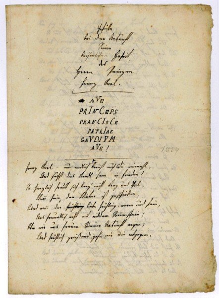 3½ SS. auf Doppelblatt. Folio. Zeitgenössische Gefühlserregung eines patriotisch gesinnten Zeitgenossen: "Franz Karl - nun endlich kommst auch Du einmahl, | Und suchst dies Landl heim in Frieden! | So herzlich freut sich lang' nicht Berg und Thal, | Wenn heim der Winter ist geschieden, | Und wenn der liebe Frühling, warum und fein, | Uns freundlich ruft mit mildem Sonnenschein; | Wie wir uns freuen Seiner Ankunft wegen; | Und fröhlich grüßend geh'n wir dir entgegen [.]" (es folgen sieben weitere Strophen zu je acht Zeilen). - Papierbedingt etwas gebräunt und mit kleinen Randläsuren.