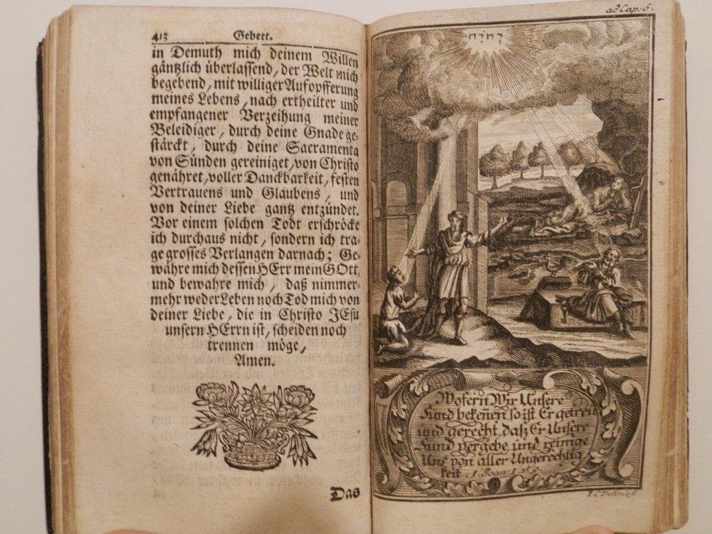 2 volumi in uno, 8°, 100x180 mm, pp. (36), 413; 439, (16), una tavola all'antiporta e completo delle 9 splendide tavole in fine di capitolo incise in rame fuori testo, assai nitida impressione dell'artista tedesco Johann Chritoph Dehne (1713-1741). Elegante rilegatura ottocentesca in piena pelle nera, taglio superiore dorato. Frontespizio del primo volume in rosso e nero, alcuni appunti a matita all'ultimca carta bianca, esemplare molto ben conservato. Il titolo in italiano reciterebbe: Palcoscenico spirituale su cui si presentano gli uomini più disprezzati e il più piccolo di tutti gli uomini ossia Gesù. *** TUTTI I NOSTRI LIBRI SONO VISIBILI PREVIO CONTATTO MAIL O TELEFONO NELLA NUOVA SEDE DI MILANO: LIBRERIA COSMOPOLIS, VIA JOMMELLI, 22. ***
