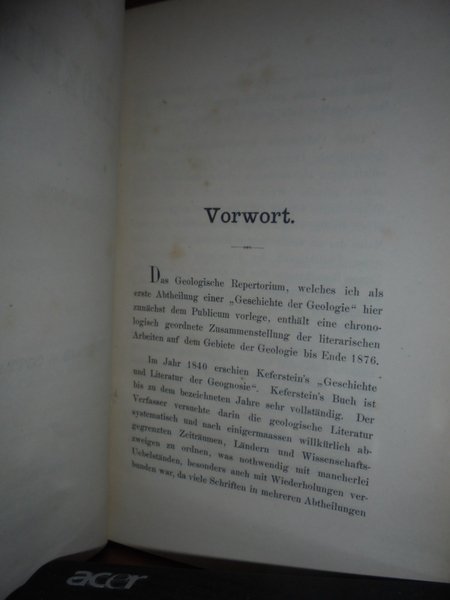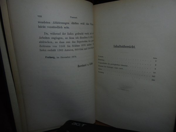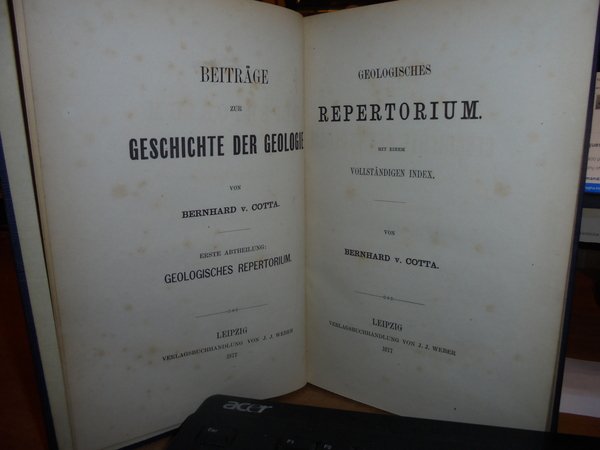 Von Bernhard v. Cotta. Leipzig, Verlagsbuchhandlung von J.J. Weber, 1877. Geologisches Repertorium mit einem Vollstandigen Index. In-8°, tela con titolo in oro al dorso. viii, 400 pp. In ottimo stato di conservazione. Uff. D - I - 1