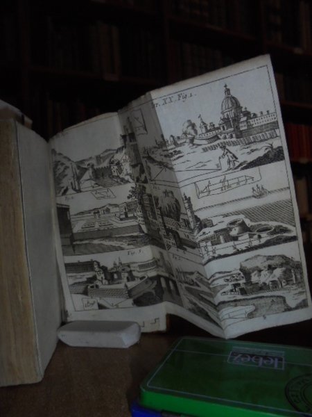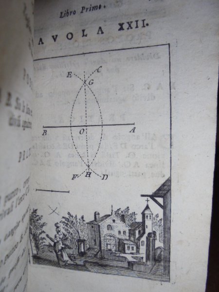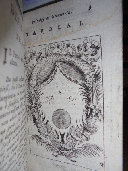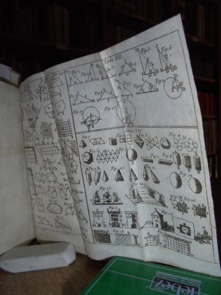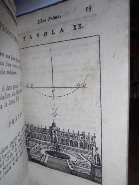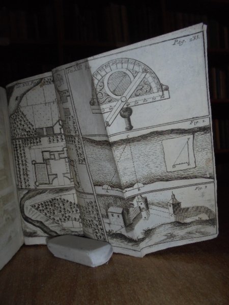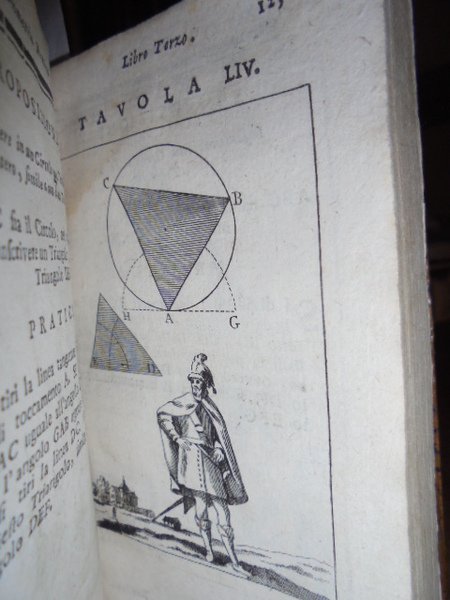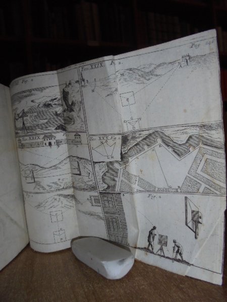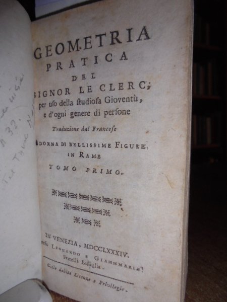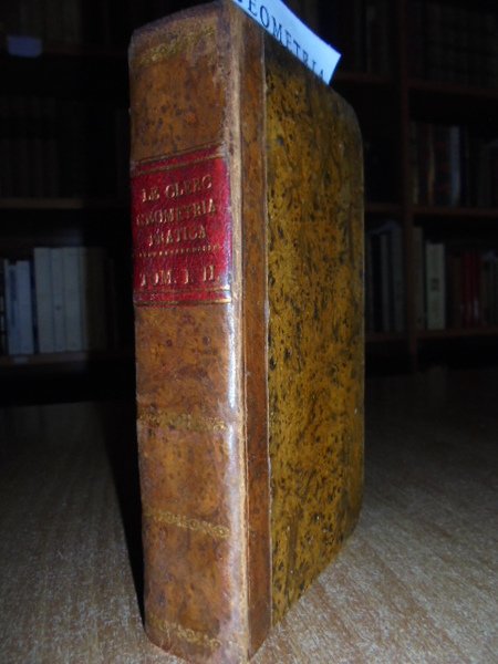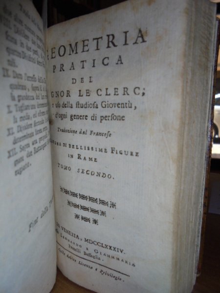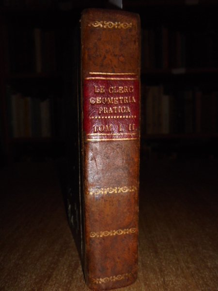 (Geometria fig. '700). LE CLERC. In Venezia, presso Antonio Zatta, 1796. Geometria pratica per uso della studiosa gioventù e d' ogni genere di persone. Due tomi in un vol. in-12°, perg. coeva, (dorso rifatto). iv, 192; iv, 263 pp. Due frontespizi. Antiporta, 82 belle tavole incise su rame f.t. spesso animate con effetto scenografico attraente nel primo tomo; 30 tavv. f.t. nel secondo tomo. Mancano nel tomo II le tavole II, IV. Libro di geometria raro. Lievi arrossature, ma buon esemplare. Neg. sotto mass.