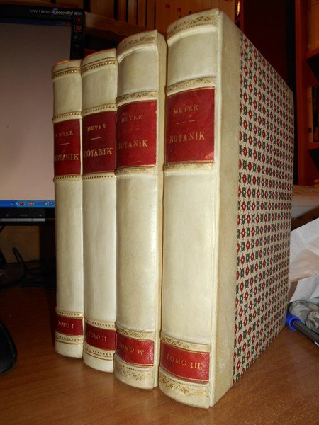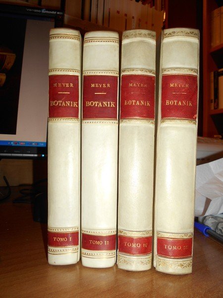 von Ernst H. F. Meyer. Königsberg, Gebrüder Bornträger, 1854-57. GESCHICHTE der BOTANIK Studien. 4 tomi in-8° piccolo, m. pergamena con angoli, titoli in oro entro tasselli in pelle ai dorsi, copertine originali parzialmente conservate. Tomo I. x, 406, (2) pp.; Tomo II. x, 439, (2) pp.; Tomo III. xvi, 554 pp. con un restauro al frontespizio e nelle pp. xv - xvi. Esemplare con lievi aloni in alcune pagine ma ben conservato con le brossure originali parzialmente conservate. Uff. F - 1
