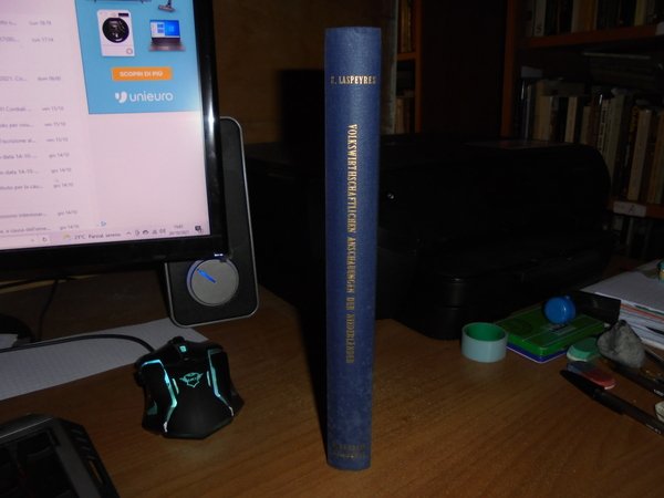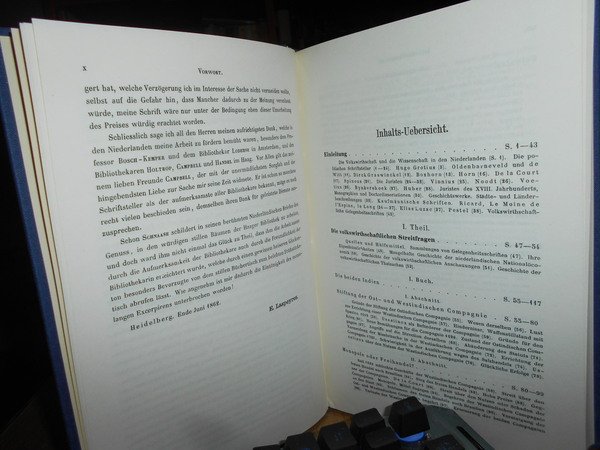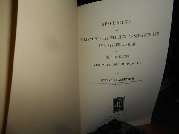 ETIENNE LASPEYRES. Nieuwkoop, B. De Graaf, 1961. Geschichte der Volkswirthschaftlichen Anschauungen der Niederländer und ihrer litteratur zur zeit der Republik. In-8°, tela bleu con titolo in oro al dorso. x, 334 pp. Lieve scoloritura alla base delle copertine ma ottimo stato di conservazione. Uff. B - III - 4 - 2