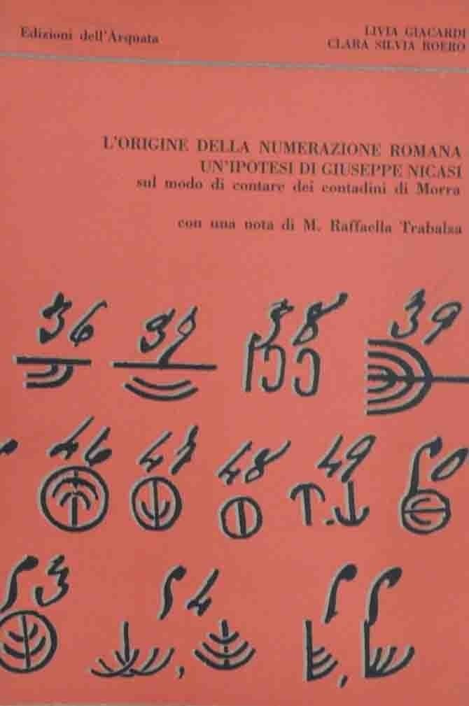 Livia Giacardi, Clara Silvia Roero, L’origine della numerazione romana. Un’ipotesi di Giuseppe Nicasi sul modo di contare dei contadini di Morra, con una nota di M. Raffaella Trabalza, Edizioni dell’Arquata, Foligno 1987, pp. 109, ill. b.n., cm 24, br. ed. Ben conservato.