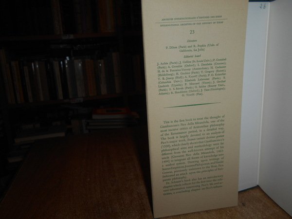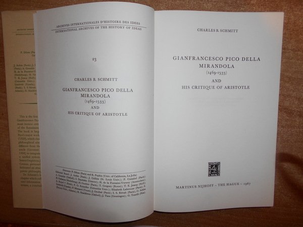 CHARLES B. SCHMITT. The Hague, Martinus Nijhoff, 1967. GIANFRANCESCO PICO DELLA MIRANDOLA (1469 - 1533) and his critique of Aristotle. In-8°, tela verde con titolo in oro sul dorso, sovracopertina. xiv, 252 pp. In ottimo stato di conservazione. Neg. esot. mob. 101