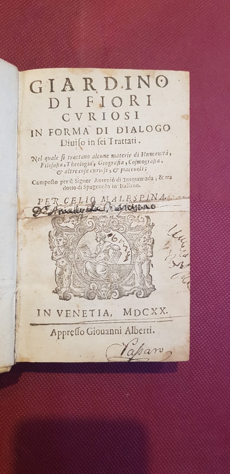 Giardino di fiori curiosi in forma di dialogo, diuiso in sei trattati. Nel quale si trattano alcune materie di humanità, filosofia, theologia, geografia. composto per il signor Antonio di Torquemada, & tradotto di spagnuolo in italiano per Celio Malespina