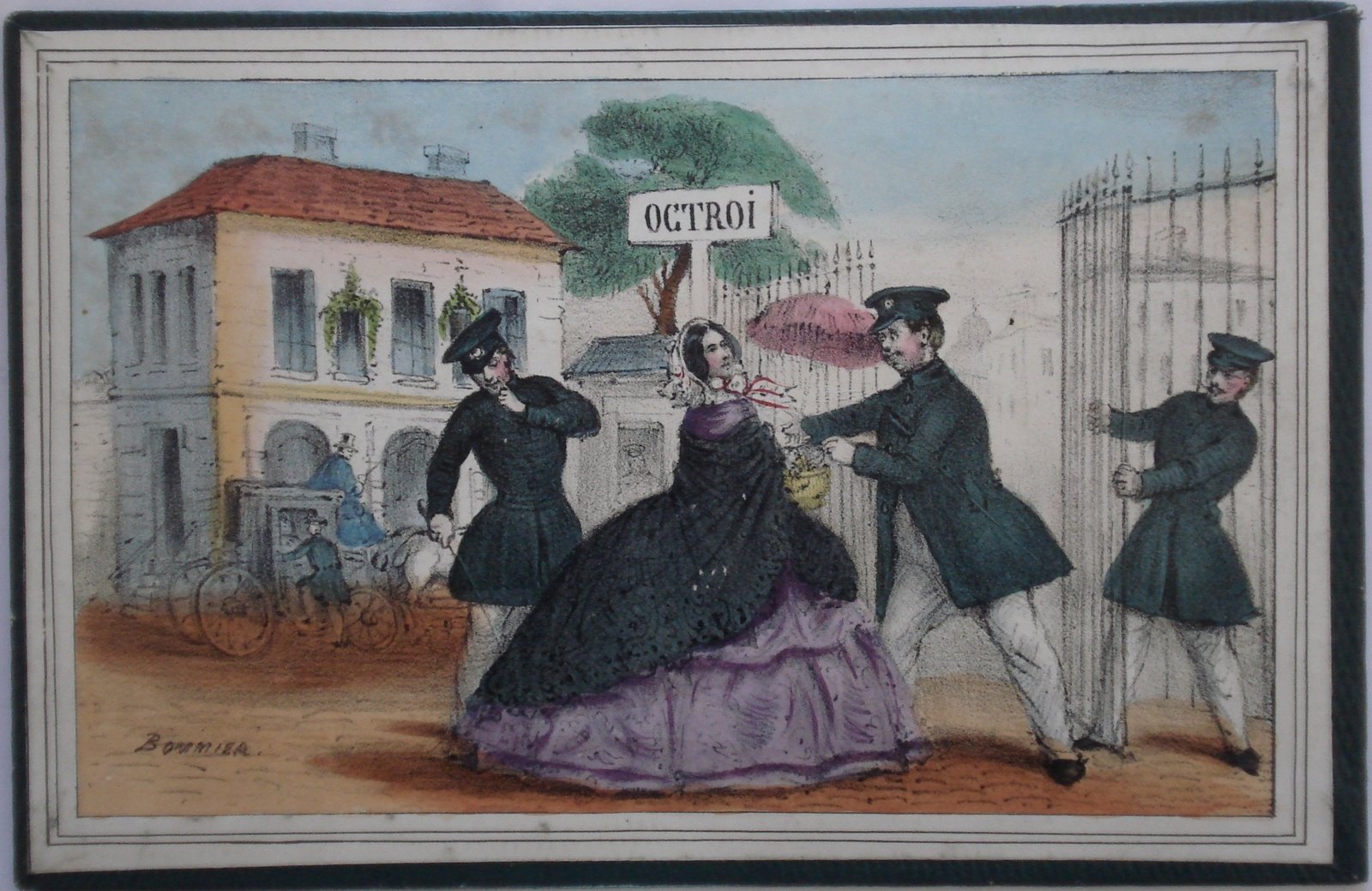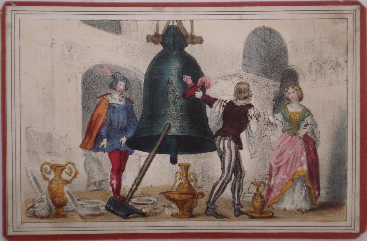 >(mm 182x121) Cinque carte da gioco in cartone illustrate con litografia a colori, un foglio di istruzioni in lingua francese sempre su cartone. Interessante esemplare del celebre gioco "Le cheval blanc", illustrato da Bommier e pubblicato da Nicolas Henri Rousseau, che tra il 1845 ed il 1864 fu stimato editore di giochi: "objets d'art et d'éducation". Il gioco del Cheval Blanc, diffusosi a partire dalla Germania dalla fine del XVIII secolo, ebbe vastissima fortuna in Europa e se ne ebbero varie edizioni, era infatti chiamato anche "la cloche et le marteau", "glocke und hammer", "bell&hammer" per via delle sue illustrazioni. Il gioco completo si compone delle 5 carte con i soggetti utili allo svolgimento: il cavallo bianco, la dogana, il martello e la campana oltre alla carta con l'unione di martello e campana; a cui vanno aggiunti otto dadi: sei con i numeri da 1 a 6, uno con il martello e uno con la campana, più delle fiches (entrambi assenti). Buon esemplare, comprendente le sole carte da gioco. Le indicazioni tipografiche sono desunte da Perrot&Mahy "l'imagerie des jeux de société au XIXème siècle".