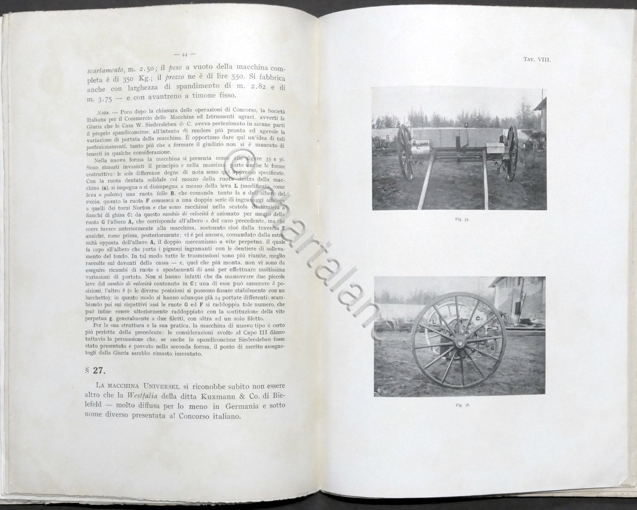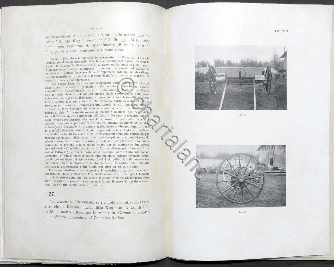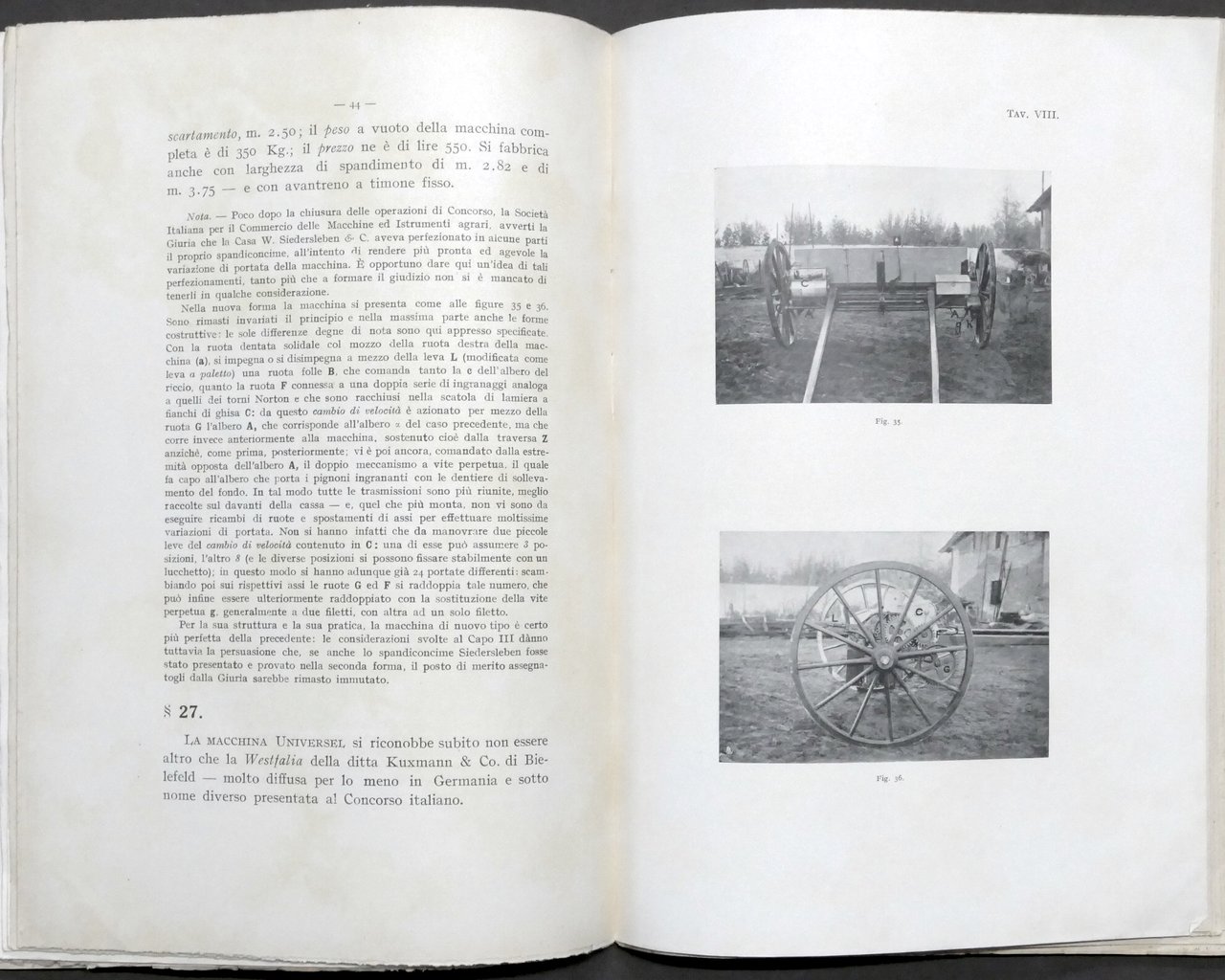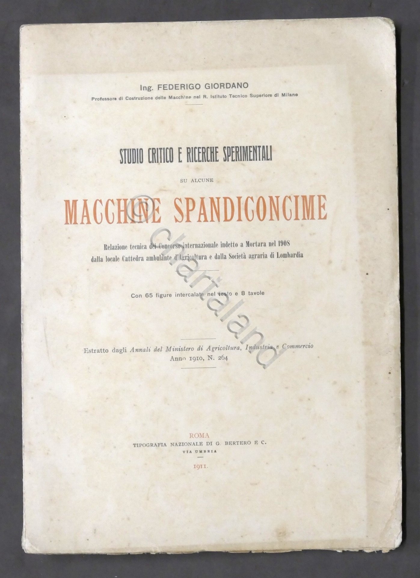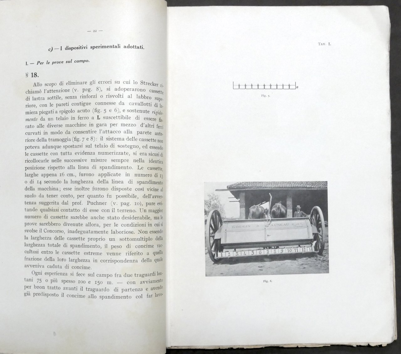 F. Giordano - Studio critico e ricerche sperimentali su alcune macchine spandiconcime - Relazione tecnica del Concorso indetto a Mortara nel 1908 - ed. 1910 Pag. 112 con 65 figure intercalate nel testo e 8 tavole. Copertina morbida - Testo in italiano. Condizioni buone. Copertina come da foto.