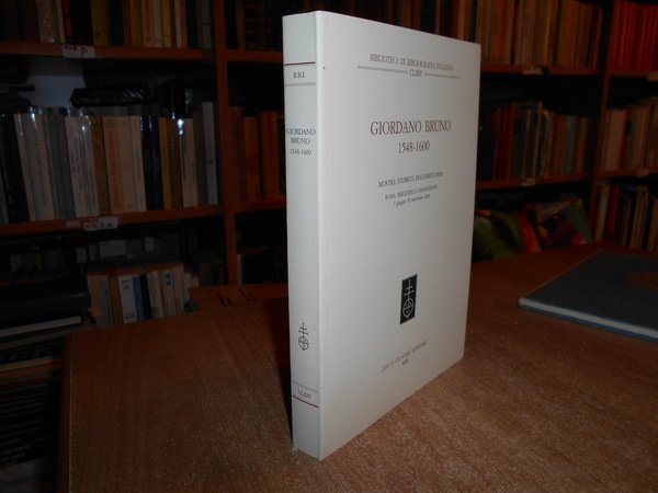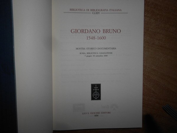 GIORDANO BRUNO 1548-1600. Roma, Mostra Storico Documentaria. Roma, Biblioteca Casanatense 7 giugno - 30 settembre 2000. Firenze, Leo S. Olschki, 2000. In-8°, cartoncino edit. CXLI, 231, (2) pp. con numerose illustrazioni n.t. e 12 tavole a colori f.t. In stato di nuovo. Neg. esot. mob. 10