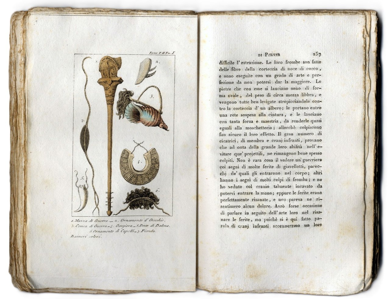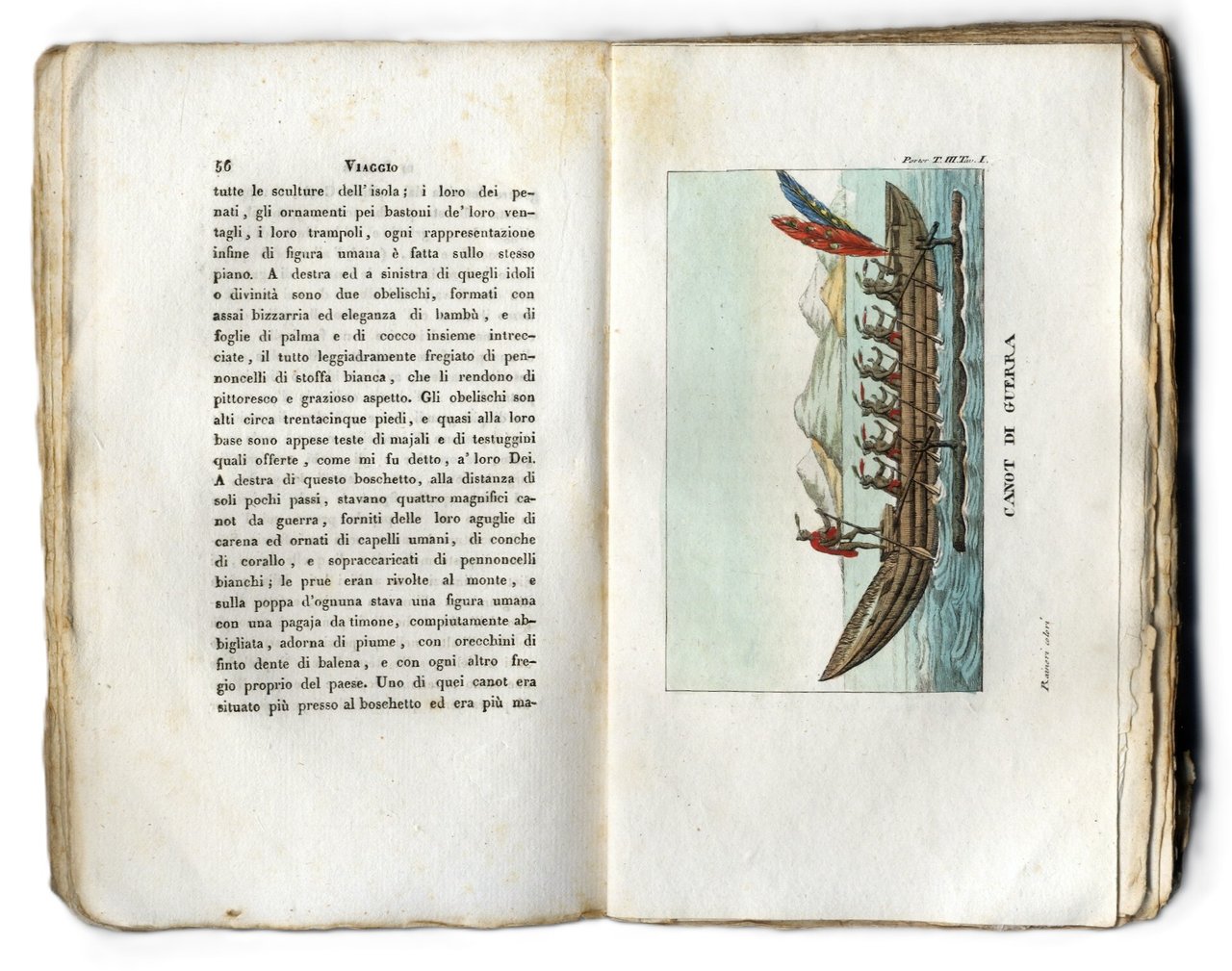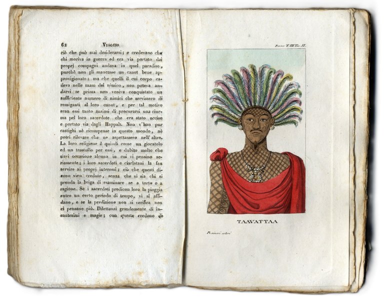 >3 volumi in-8 piccolo, pp. XII, (1), 247, (1 bianca); 267, (1 bianca); 275, (1 bianca), brossure in carta. Completo di ritratto dell'autore in antiporta al volume I, 1 grande tavola delle isole Washington ripieg. f.t. al vol. II e 11 tavole f.t., il tutto inciso in rame; alcune tavole presentano una bella acquerellatura coeva. Prima edizione in italiano, traduzione a cura di Contarini, di interessante resoconto "...Che contiene la descrizione delle isole del Capo-Verde, delle coste del Brasile, della Patagonia, del Peru', del Chili e delle isole Gallapagos; non che una relazione del gruppo delle isole Washington, delle maniere, costumi e foggie di quegli abitanti ec. ec.". Ottimo esemplare in barbe. Sabin XV, 306.