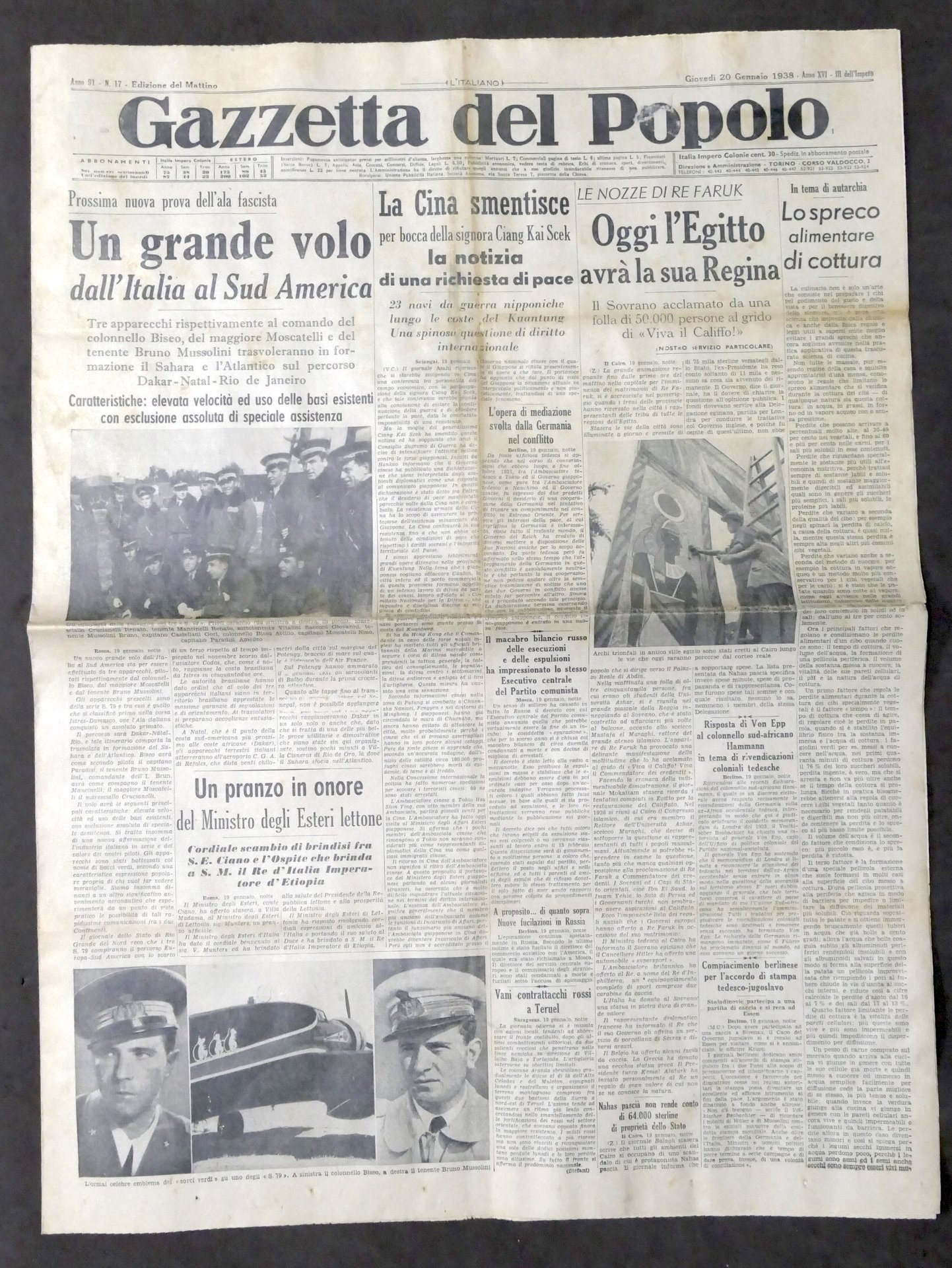 Giornale Gazzetta del Popolo N. 17 - Oggi l'Egitto avrà la sua Regina - 1938 Testo in lingua italiana, Pag. 8 con illustrazioni Condizioni buone