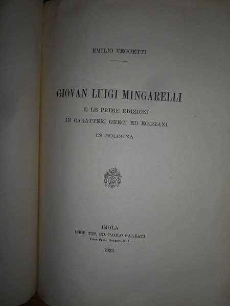 Emilio, Veggetti. Imola, Coop. Tip. Ed. Paolo Galeati, 1923. GIOVAN LUIGI MINGARELLI e le prime edizioni in caratteri Greci ed Egiziani. In-8°, br. orig. 23 pp. Opuscolo ben conservato con dedica firmata dell' Autore nella prima bianca. Uff. A - II - 3 - 2