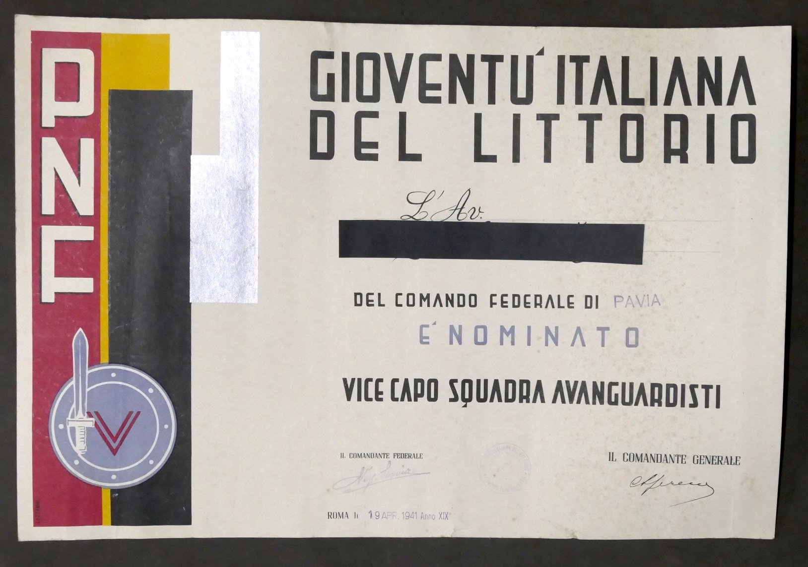 Gioventù Italiana del Littorio - Nomina a vice capo squadra avanguardisti - Comando Federale di Pavia - 1941 Dimensioni: 32 x 47 cm ca. Lingua italiana. Condizioni generali buone.