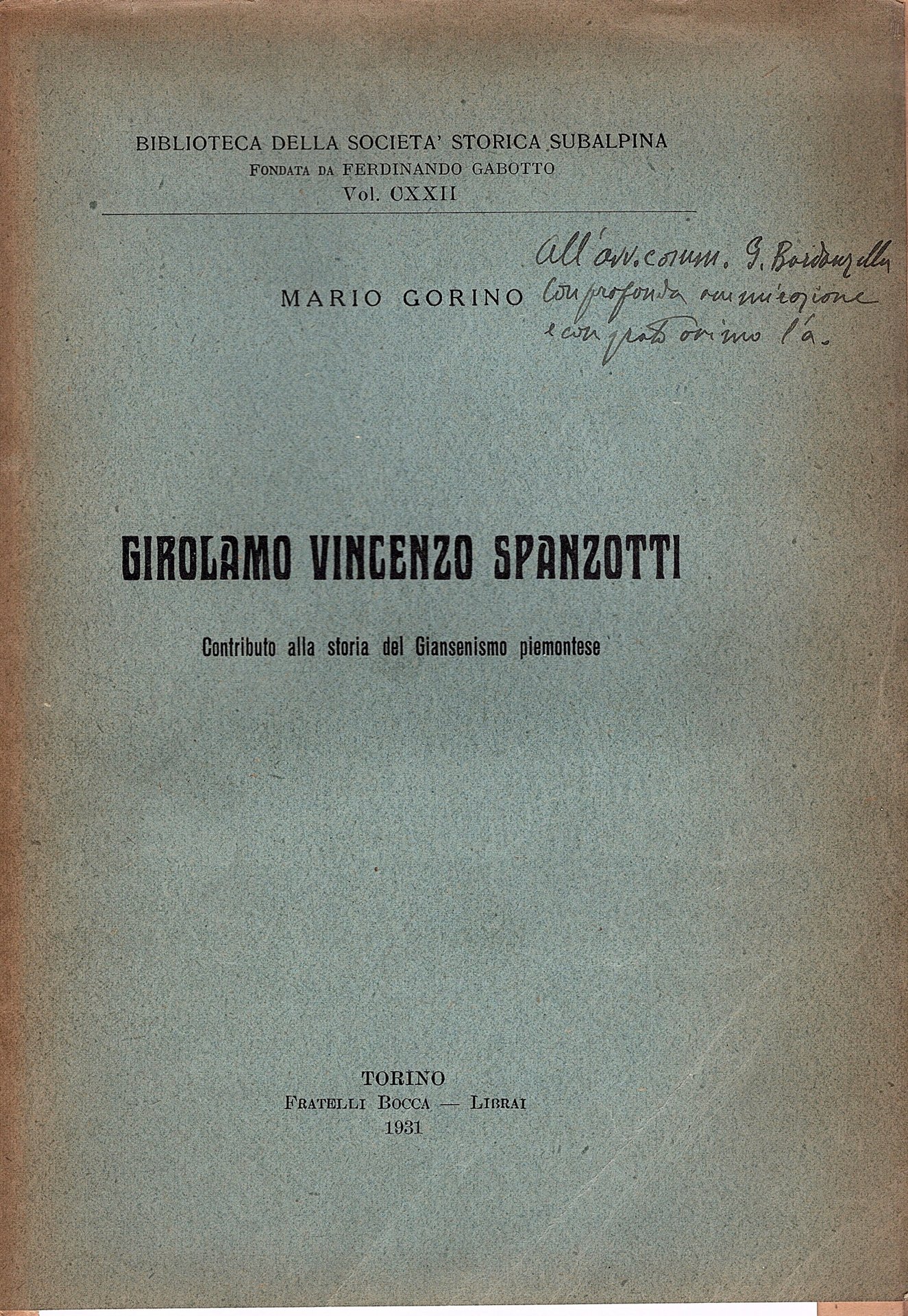 In-8° (25x18 cm), pp. (2), 264, (5) di cui 6 di catalogo delle pubblicazioni 1896-1931 della Società Storica Subalpina, brossura editoriale con titoli al dorso e al piatto anteriore. Biblioteca Società Storica Subalpina, vol. 122. Lievi bruniture ai piatti e al dorso ma più che buon esemplare intoso con invio autografo dell'autore al piatto anteriore. Fondamentale studio monografico sulla poliedrica figura dello Spanzotti (1741-1712) la cui produzione spazia dal diritto alla filosofia politica con incursioni teologiche.