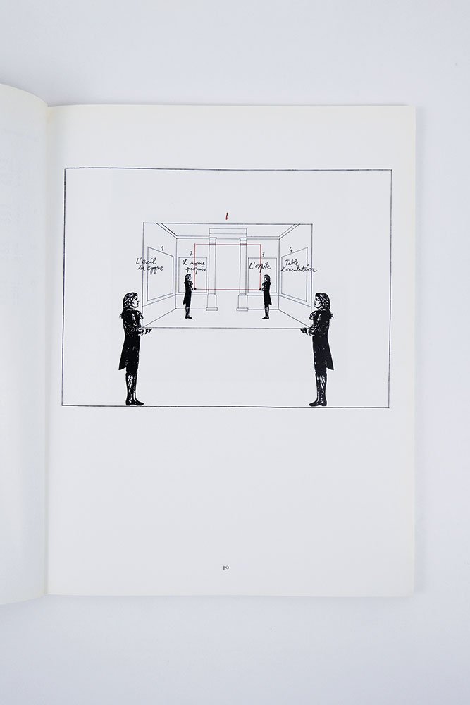 - brossura editoriale con alette, al piatto superiore titoli stampati in rosso e disegno di una sala espositiva con al centro una cornice dorata, titoli in rosso, al piatto inferiore testo di presentazione,