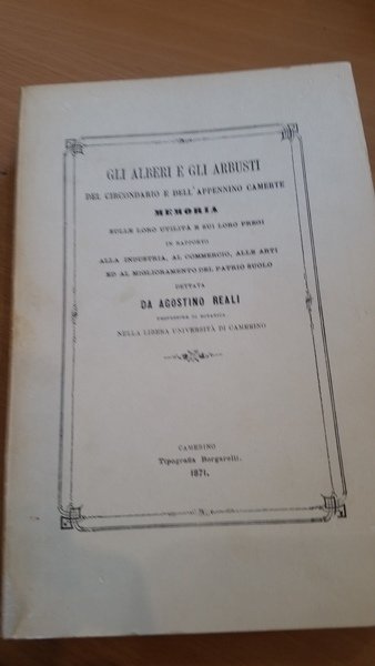 gli alberi e gli arbusti del circondario e dell'appennino camerte, memoria sulle loro utilita' e sui pregi in rapporto all'industria al commercio ed al miglioramento del patrio suolo
