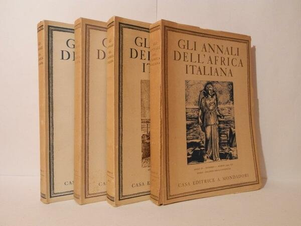 4 volumi, 8°, 26 cm, pp. 1129, diverse tabelle e figure all'interno. Numerose tavole fotografiche fuori testo. Legature in brossura editoriale illustrata, titolo al piatto e dorso, a cura del Ministero dell'A. I. Ben conservato, copertina del primo volume staccata, ma nell'insieme esemplare molto buono. Interessante documento d'epoca, ricco di immagini e notizie. Silografie di Diego Pettinelli.. *** TUTTI I NOSTRI LIBRI SONO VISIBILI PREVIO CONTATTO MAIL O TELEFONO NELLA NUOVA SEDE DI MILANO: LIBRERIA COSMOPOLIS, VIA JOMMELLI, 22. ***
