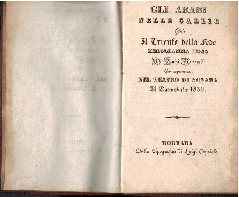 Gli Arabi nelle Gallie ossia il trionfo della Fede. Melodramma serio di Luigi Romanelli da rappresentarsi nel teatro di Novara il carnevale 1830.