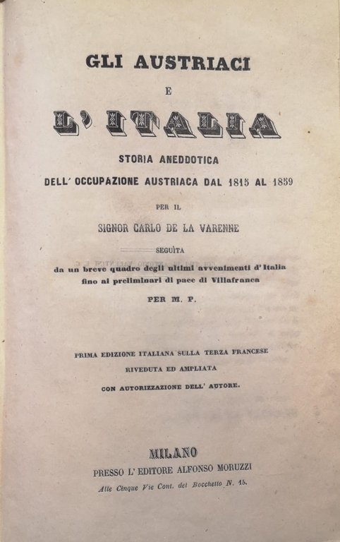 GLI AUSTRIACI E L'ITALIA. - Storia aneddotica dell'occupazione austriaca dal 1815 al 1859. Prima edizione italiana sulla terza francese, riveduta ed ampliata con autorizzazione dellautore.