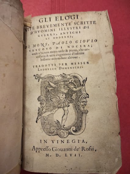 Gli Elogi. Vite brevemente scritte d’huomini illustri di guerra, antichi e moderni di Mons…. Vescovo di Nocera. Onde s’ha non meno utile et piena, che necessaria et vera cognitione d’infinite historie non vedute altrove. Tradotte per Messer Lodovico Domenichi.