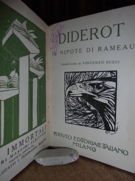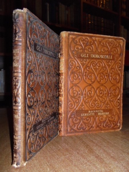 Gli immortali. Istituto Editoriale Italiano, raccolta Luzzati - Martini, senza data. A.F. Prévost. Storia di Manon Lescaut e del Cavaliere des Grieux. Traduzione di Ugo Bernasconi, una prefazione di Guy De Maupassant. Diderot. Il nipote di Rameau. Traduzione di Vincenzo Bucci. Volume XXXI e volume 1. 2 volumi in-16°, piena pelle edit. artisticamente decorata. 181, (1) pp.; 178 pp. In buono stato di conservazione. Neg. magazz. scat. 9.