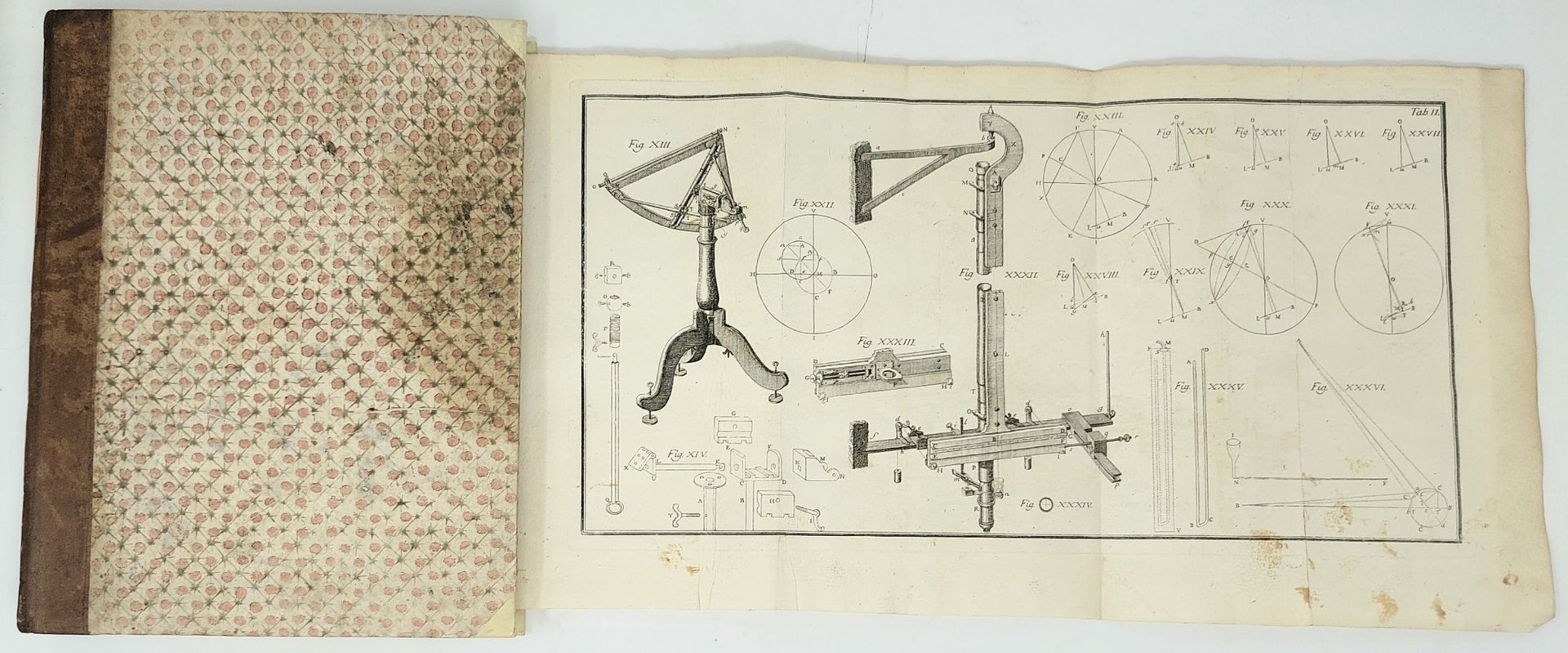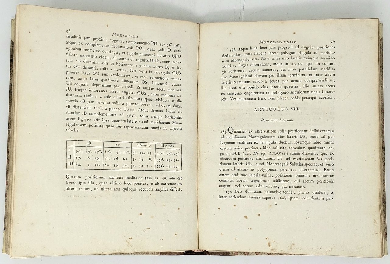 >in-4, pp. (12), 195, (3), e 3 tav. ripieg. f.t., Leg. mezza. pelle, tit. oro su tassello al dorso. Armi Sabaude sul frontespizio e 3 grandi tavole di strumenti e figure geometriche più volte ripiegate in fine. Prima ed unica edizione, di opera molto rara che descrive l'intera operazione della misurazione della lunghezza di un grado di un arco di meridiano in Piemonte. Iniziata nel 1760 questa notevolissima impresa richiese anni di estenuanti osservazioni astronomiche (fu appositamente apprestato un piccolo osservatorio in Torino, ed un osservatorio elettrico a Superga), di laboriosi conteggi, di faticosi viaggi e rilievi, e soltanto nel 1764 il Beccaria (di Mondovi 1716-1781) diede comunicazione dei risultati ottenuti. Bell'esemplare con grandi margini. Eandi, p. 39/41; Riccardi, I-100, «Raro...dotta relazione». Enciclop. Ital., VI-464.