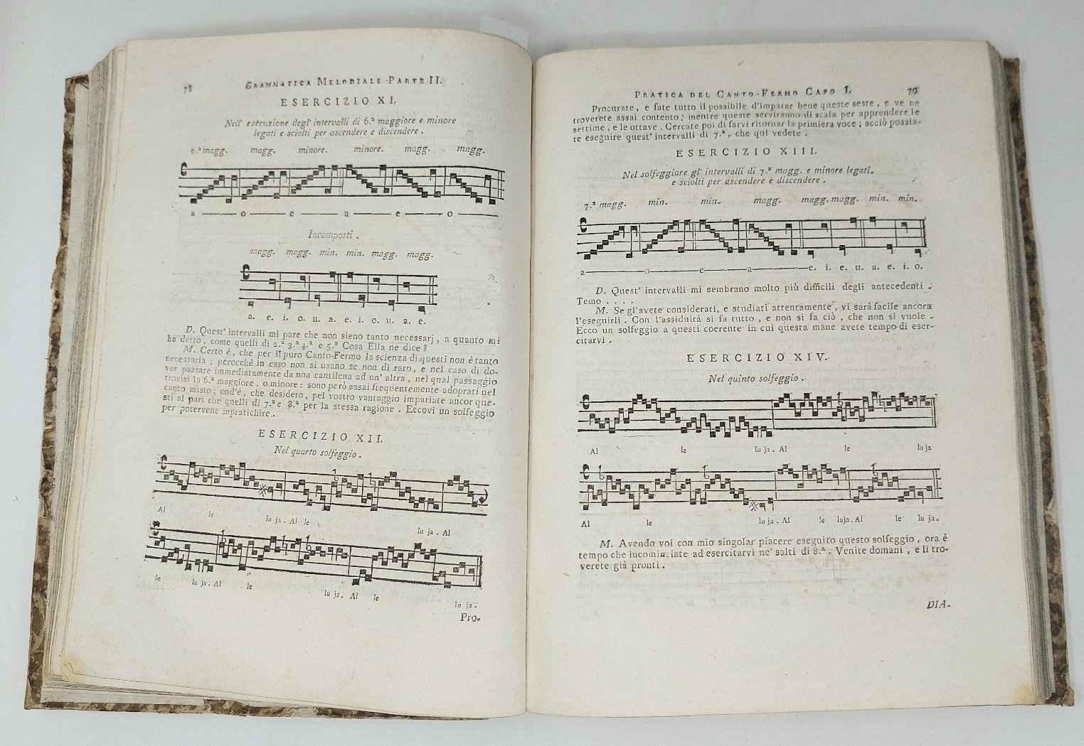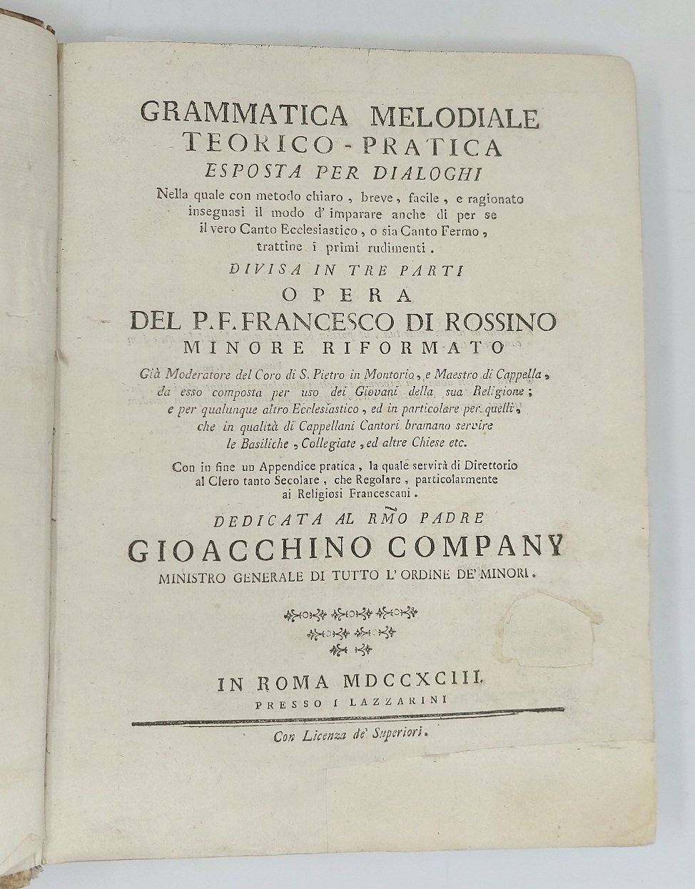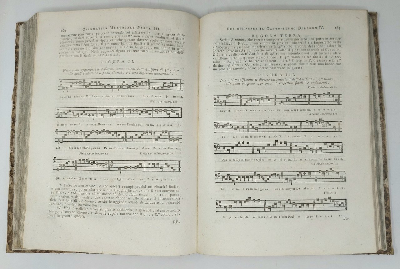 >in-4; pp. XXIV-396; leg. coeva m.perg. e ang., tit. ms. al dorso. Dedicata al ''padre Gioacchino Company ministro generale di tutto l'ordine de' minori''. Prima ed unica edizione, illustrata da un gran numero di esempi musicali n.t. L'autore, frate minore, Moderatore del Coro di S.Pietro in Montorio, e Maestro di Cappella, vi tratta in forma di dialogo nella prima parte la teoria del canto fermo in 4 capitoli, nella seconda la pratica in 14 capitoli, e in fine le regole per la composizione, in 20 dialoghi con 15 esercizi; segue un'Appendice pratica, ''la quale può servire di Direttorio Corale agli Ecclesiastici''. Buon esemplare, fresco e marginoso (due antichi restauri nel margine bianco del titolo). RISM II,717-8. Eitner VIII,327. Fétis VII,329. Hirsch I,512. Gregory-Bartlett I,236.