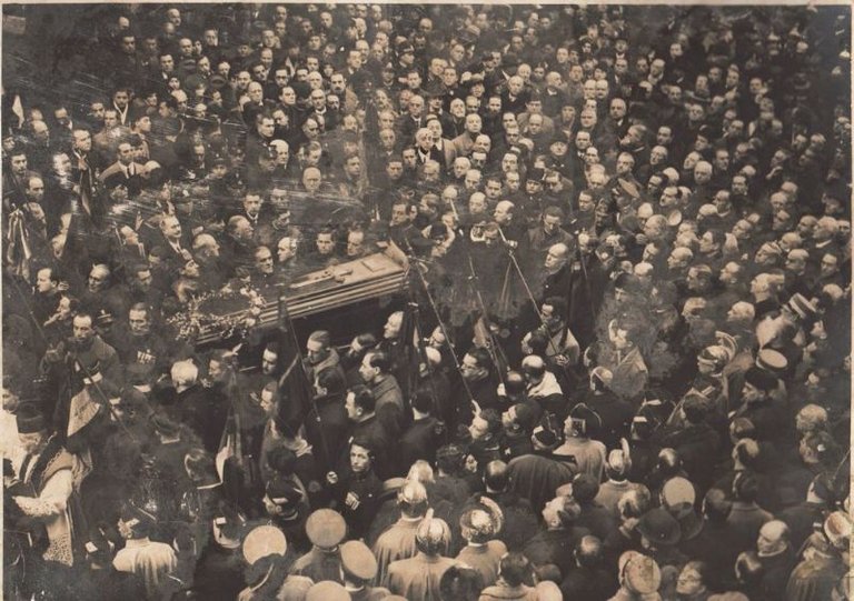 Grande fotografia raffigurante il funerale di Arnaldo Mussolini, fratello minore di Benito. Dietro al feretro si vedono Mussolini e molti altri tra parenti e gerarchi.
