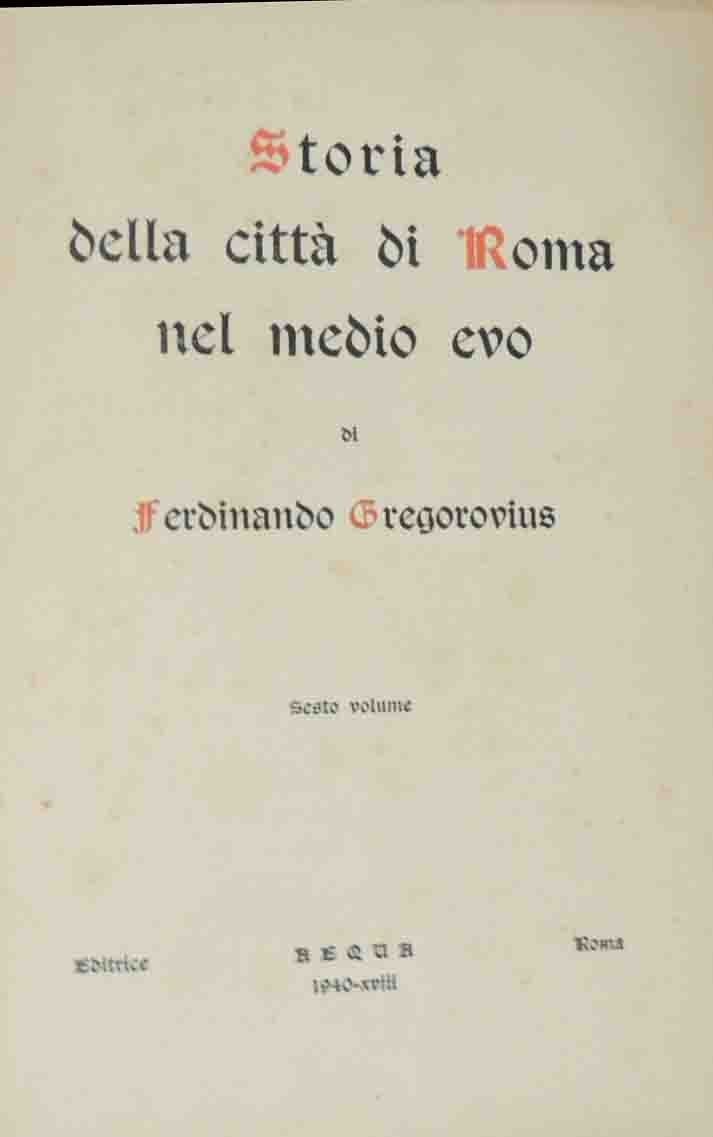 Ferdinando Gregorovius, Storia della città di Roma nel medio evo, Sesto volume, Editrice Aequa, Roma 1940, nuova ed. integrale a cura di Luigi Trompeo, pp. 353, cm 20, br. ed. Sesto di quattordici volumi. Titolo del volume: Storia della città di Roma nel decimo secolo (i primi sei capitoli del sesto libro si trovano nel quinto volume). Leggere tracce d’uso al dorso, minime fioriture, carta lievemente brunita, per il resto molto ben conservato. Intonso.
